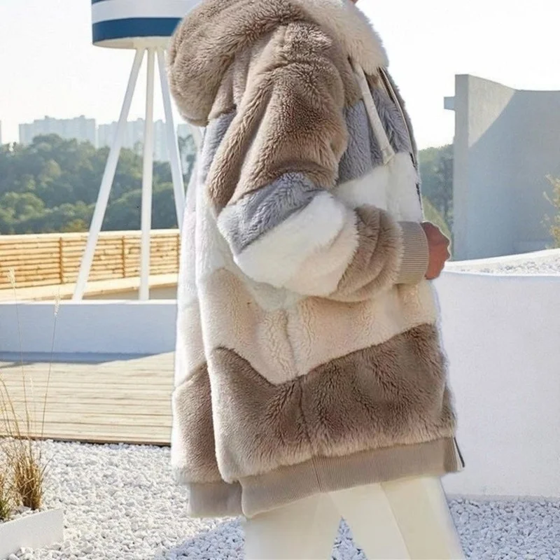 Новинка 2021, осенне-зимняя теплая плюшевая куртка с капюшоном и карманами на молнии, модель размера плюс XL-5XL Plus, бархатная теплая Женская куртка