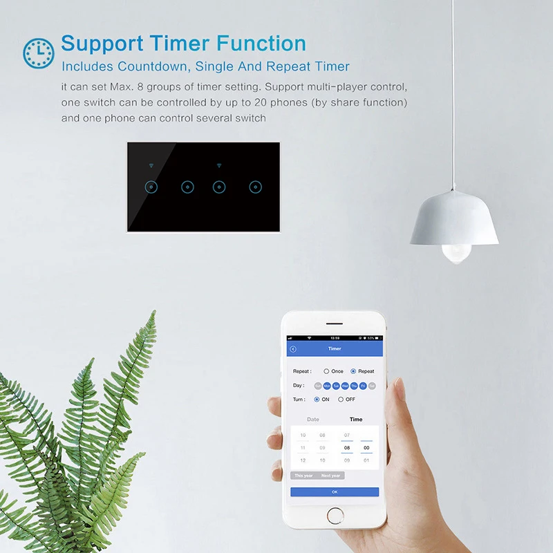 Умный таймер автоматически включается/выключается после установки таймера для этого выключателя, который необходим для ежедневного планирования и принесет Вам комфортный и умный образ жизни.