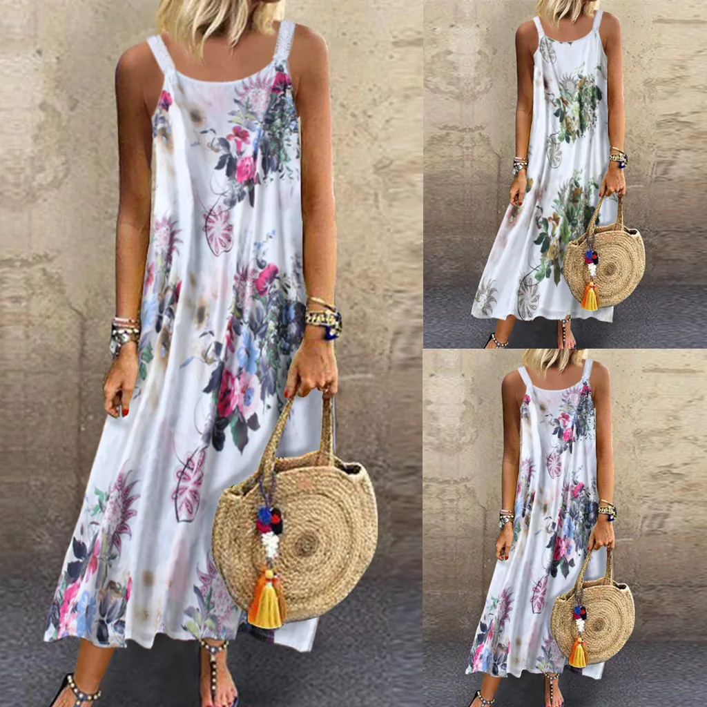 Женское платье макси, летнее винтажное офисное платье без рукавов, с круглым вырезом и цветочным принтом, размера плюс