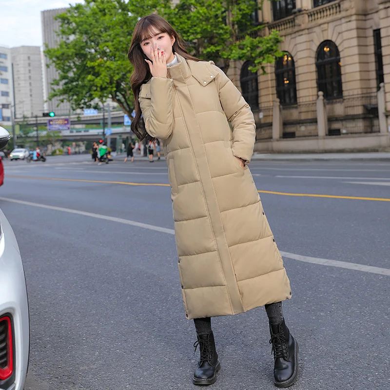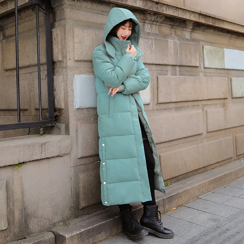 Элегантный женский X-long Зимний пуховик с капюшоном, женская теплая Модная тонкая куртка с разрезом, пальто для женщин, новинка 2021