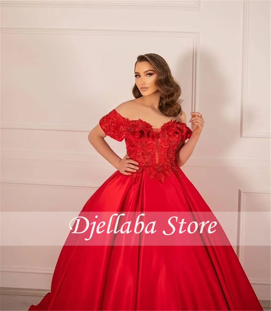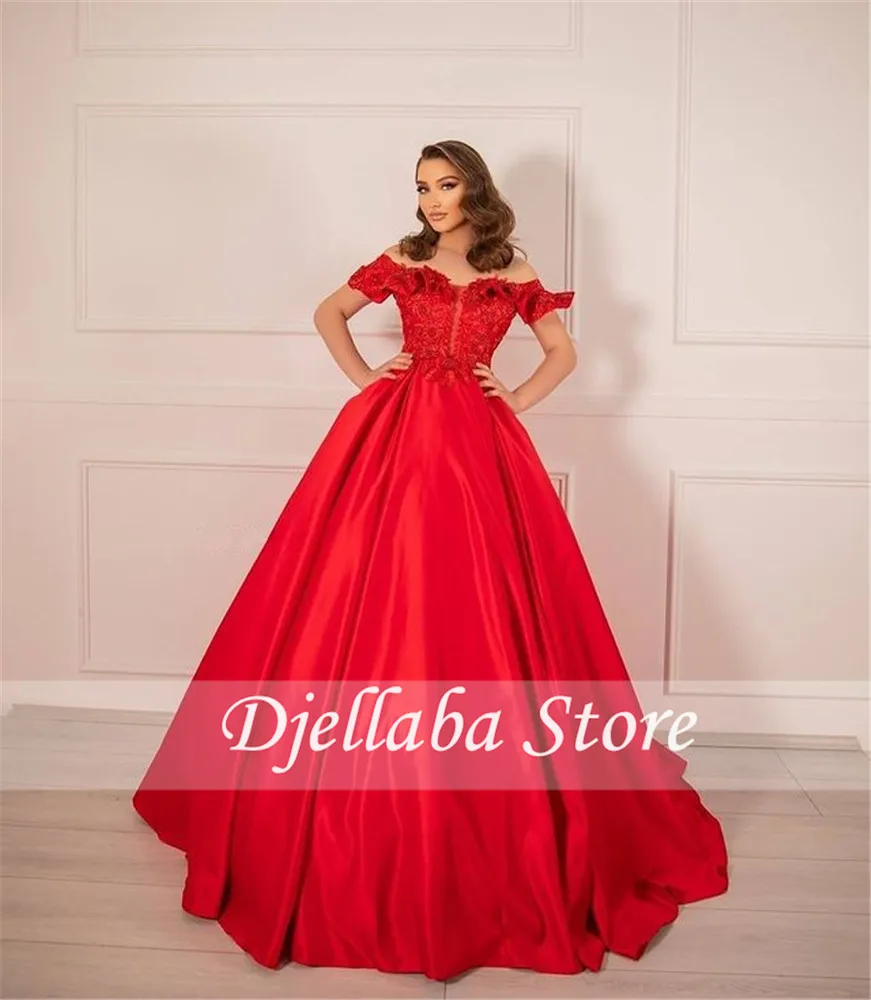 Красные вечерние платья, стильное Атласное Бальное платье принцессы с открытыми плечами, кружевные вечерние платья, женское официальное платье с аппликацией, длинное индивидуальное изготовление