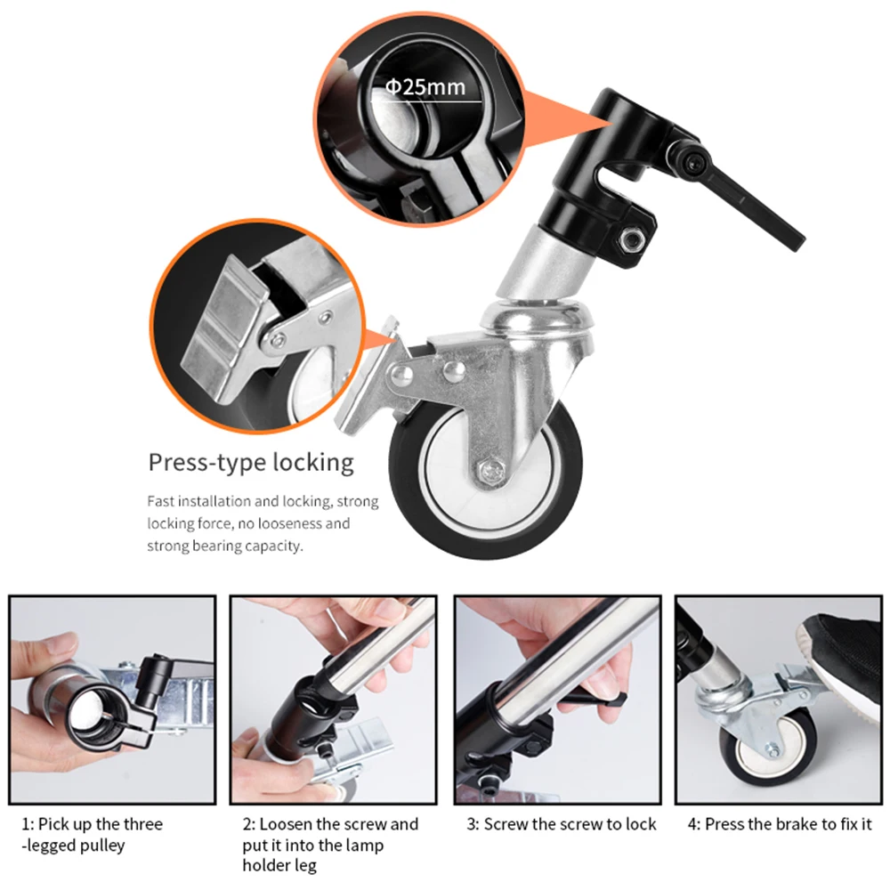 Особенности: Светильник-Стойка подходит для большинства фотографий C, длина стопы которых составляет 25 мм. Может улучшить гибкость подставки для подвижных фотографий, легко установить и снять. Сверхпрочная металлическая конструкция, которая обладает высокой твердостью, долговечностью и долгим сроком службы. Внешнее колесо изготовлено из резинового материала, износостойкого и противоскользящего, вращается на 360 ° и плавно перемещается без шума и следов от сопротивления. С системой шагового замка, чтобы зафиксировать и отпустить колеса, которые могут гарантировать безопасность вашего фотографического оборудования, безопасно и надежно. Характеристики: Материал: металл + пластик + резина Диаметр монтажного отверстия: 25 мм Диаметр колеса: 75,8 мм Упаковочный лист: 3 * колесики