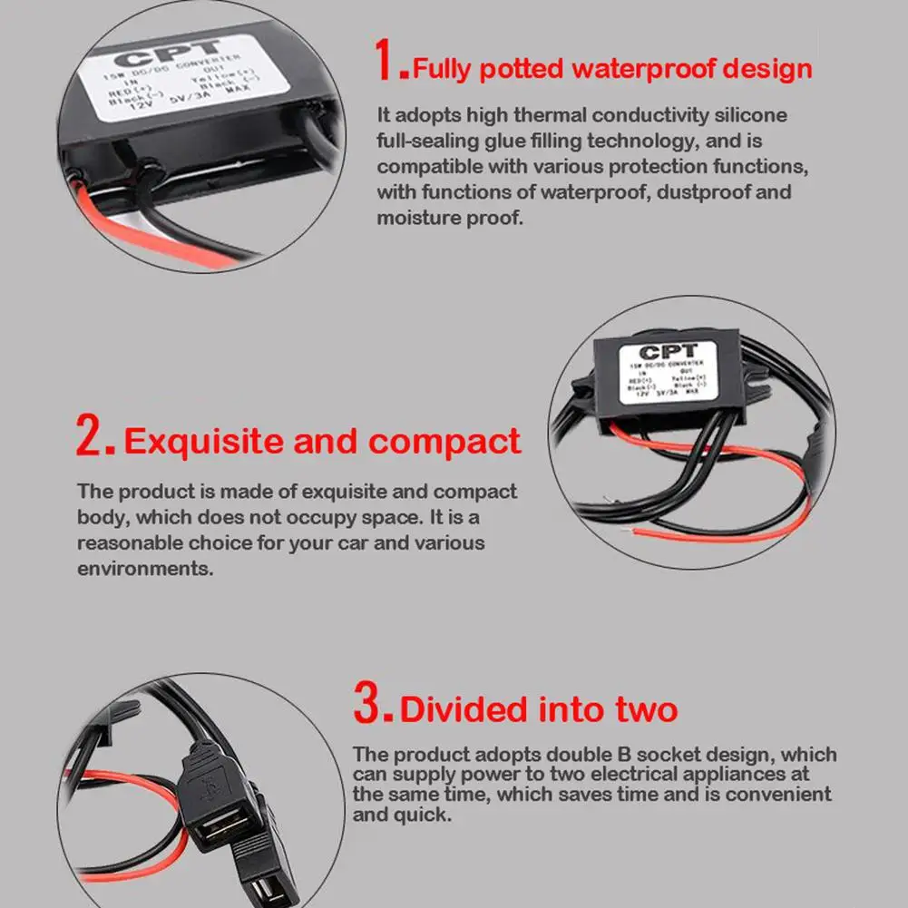 DC-DC преобразователя постоянного тока 12 В до 5 В пост 3A 15 Вт двойной USB кабель для зарядки для ступенчатого понижения Мощность Выход автомобильный адаптер для выращивания растений в горшках Водонепроницаемый Питание модульОписание:Изготовлено с импортными интегрированными модулями регулятора переключения,Качество стабильное и надежное.Синхронное выпрямление, коэффициент конверсии выше 96%, а тепло чрезвычайно низкое.Перенапряжения, перегрузки по току, перегрева, короткого замыкания, автоматической защиты,Хорошо работает при восстановлении.Эпоксидная горелка, антивибрация, водонепроницаемость, влагостойкость, защита от пыли, долгосрочное стабильное и надежное качество.Ультратонкий, маленький размер, высокая эффективность, простота установки и использования.Спецификация:Модель: CS-018Входное напряжение: DC8-20V, (12 В становится 5 В)Выходной параметр: DC5V3A, 15 ВтРазмер: 41x21x18ммПосылка включает в себя: