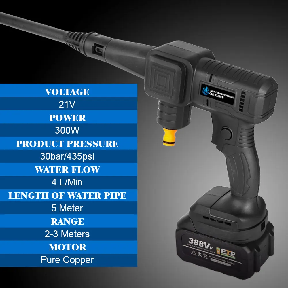Напряжение: 21 вМощность: 300 ВтДавление Продукта: 30 бар/435psiРасход воды: 4 л/минДлина водопроводной трубы: 5 метровДиапазон: 2-3 метраДвигатель: чистая медь