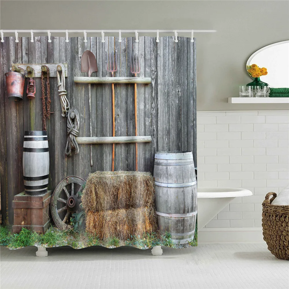 Занавеска для ванной с деревянной дверью и крючками, в винтажном стиле