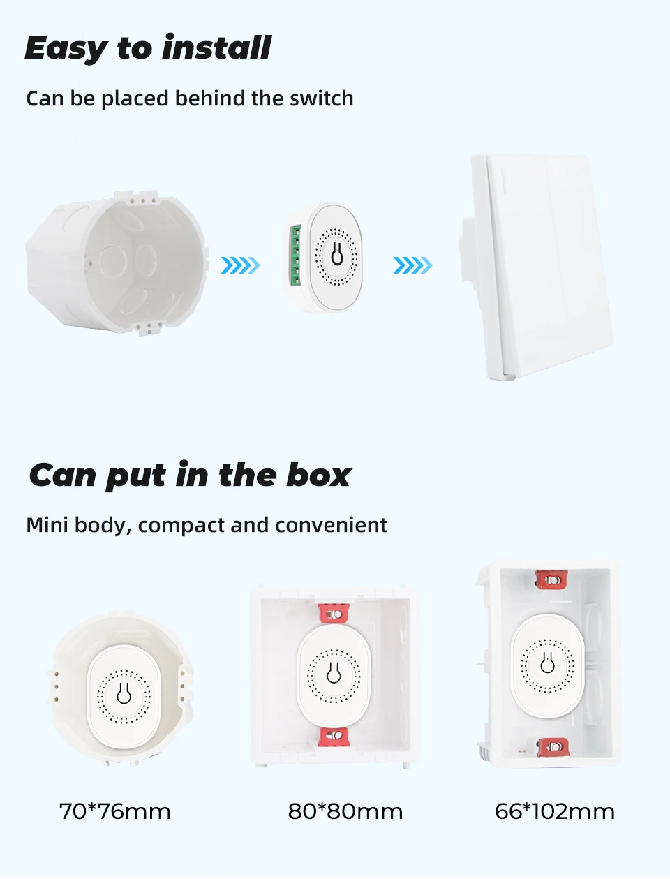 Пункт продажи:1. Поддержка: переключатель сброса, сенсорный переключатель, механический переключатель, переключатель скорости.2. WIFI + Bluetooth двойной режим, распределительная сеть быстрее и стабильнее3. Программа Tuya, поддержка Amazon Alexa, Google Home, Tmall Genie, вы можете регулировать скорость по голосу4. Мини-фигурка, можно положить в нижнюю коробку, более удобно устанавливать5. После отключения сети, как только WIFI активируется снова, устройство, подключенное к модулю, автоматически подключается к вашей сети WIFI