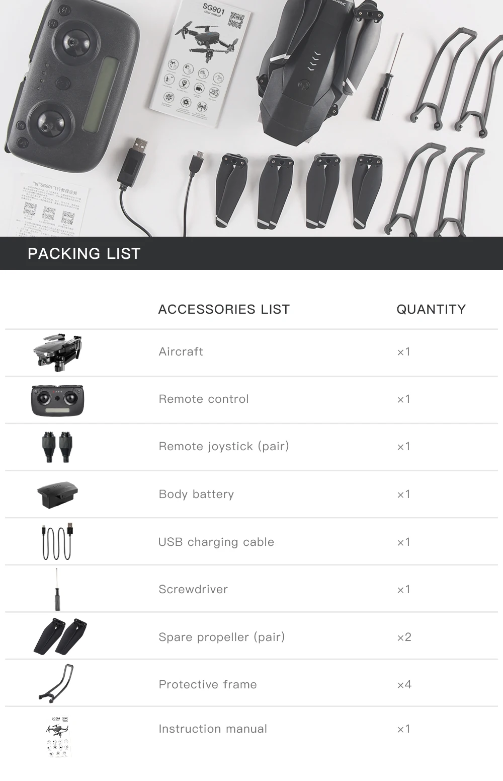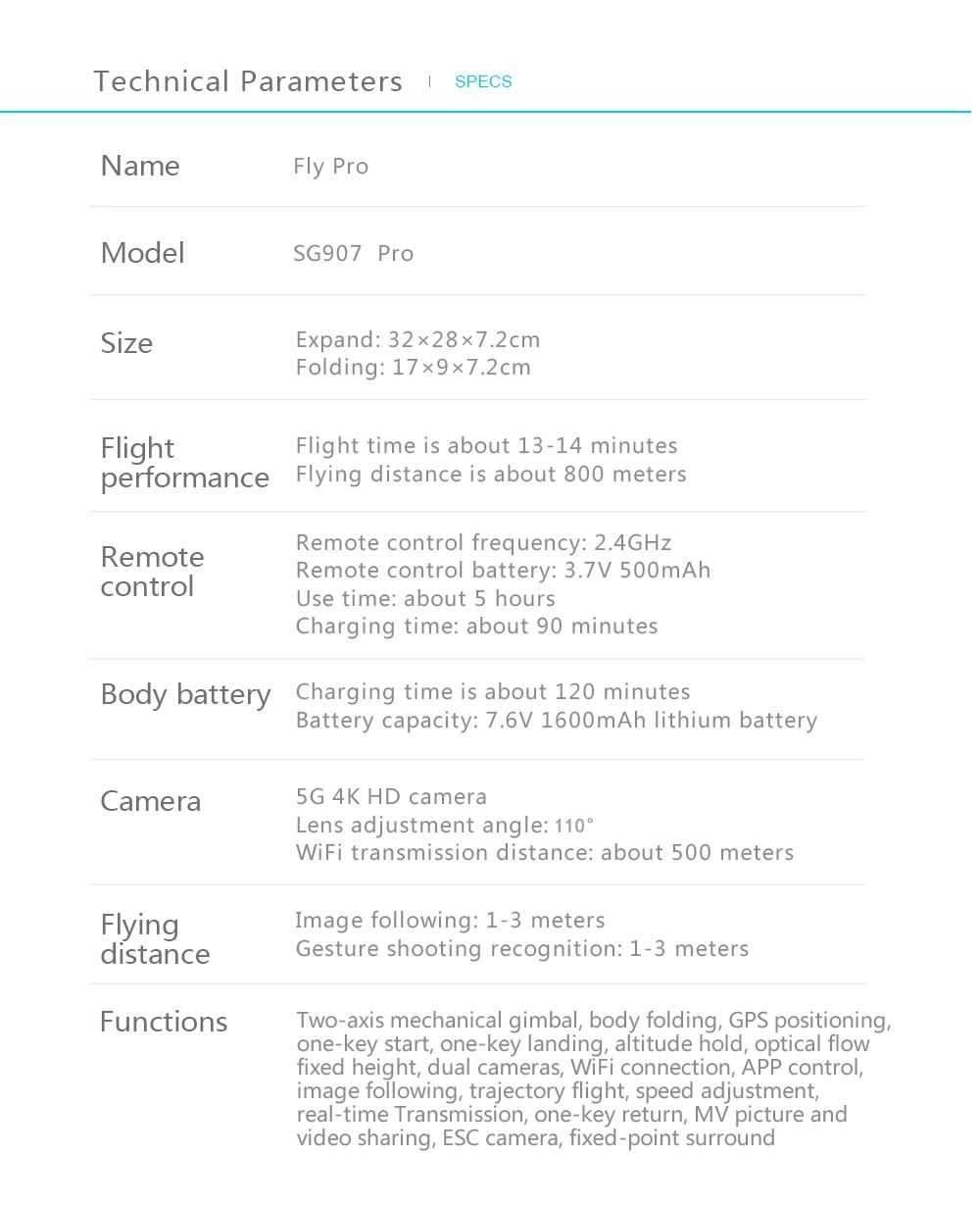 1. Первые 3 варианта-версия SG901, средние 8-sg907 MAX verison, последние 8-версия SG907 PRO. Характеристики: SG907 MAX Вес дрона: 306 грамм (с батареей внутри) Особенности:3-осевая Карданная камера 4K Экшн-камераGPS возвращается в точку взлета с помощью одной кнопки, и низкая мощность возвращается в воздух, и нет сигнала на возврат.GPS Smart Follow: после того, как самолет подключается к GPS, функция приложения follow включена, и самолет следует за мобильный телефон.Изображение: 1-5 м от самолета для определения предмета и выполнения автоматического полета.Распознавание Жестов: в пределах 1-5 м от самолета, сделайте жесты камеры/жесты камеры к камере.Многоточечное планирование полета: самолет автономно летает по заданному маршруту, и игрок концентрируется на съемке.Окружность точки: Найдите центр и перемещайте желаемый радиус окружающего света с помощью джойстика.Функция восстановления самолета: непрерывно нажимайте значок gps-сигнала 3 раза, чтобы открыть интерфейс карты, карта показывает конечное расстояние самолета, широту и долготу.MV характеристики: фильтры, видеоэффекты, фоновая музыка, фото/видео обменХарактеристики продукта:Объектив камеры: 120 °Регулируемый угол камеры: 110 ° + 90 ° + 60 °Время полета: около 25 минутВремя зарядки: около 2 часовРасстояние управления (свободное взаимодействие и отсутствие окклюзии):1200 мРасстояние передачи изображения Wi-Fi (свободное взаимодействие и отсутствие окклюзии):800 мGPS следуй за мной: 30 мИзображение Следуйте за мной: 1-5 мФокусное расстояние: 50x зумРучная съемка жестов/видеозапись: 1-5 мРазрешение видео 4K:2048*1080(TF)Режим SD: 1208*720 (приложение)Режим HD: 2048*1080 (приложение)Разрешение фото 4K:4096*3072P(TF)4096*3072P (приложение)Камера пониженного обзора: 1280*720pЧастота кадров: 25 кадров в секундуЕмкость интеллектуального литиевого аккумулятора: 7,6 В 2600 мАчОкружность фиксированной точкиАэрофотосъемка с защитой от тряскиФото/видео поделитьсяДвойной режим GPS/ГЛОНАССSG907 максHD камераСкладывается и разворачиваетсяСян 3-Трехосевой самостабилизирующий карданный шарнир и 4k класс кино-