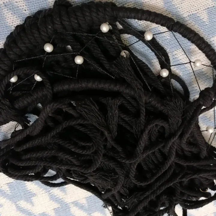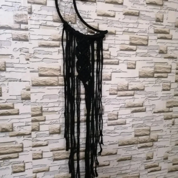 Гобелен я выбрала луну. Вязание макраме. Пришло в воздушном пакете. Свернуто аккуратно. Изделие не пострадало. Смотрится отлично. Думаю ещё интереснее если переплести с гирляндой. Нитка средней толщины. Плетение аккуратно. Длина луны 20 сантиметров. Длина всего изделия 96 сантиметров.