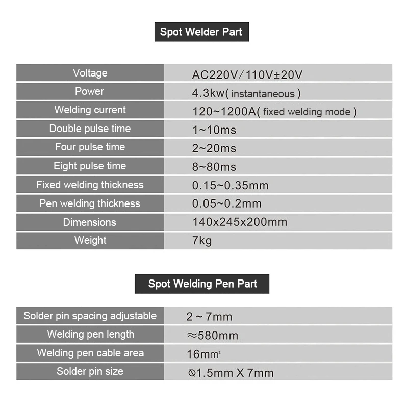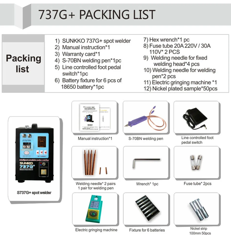 Характеристики: 100% новые и высококачественные. Тип: точечный сварочный аппарат для батареи Модель: SUNKKO 737G + Входное напряжение: 110 В/220 В мощность: 4,3 кВт (мгновенный) Макс. Сварка Толщина: 0,35 мм сварочный ток: 120A-1200A (Push-up режим сварки) предохранитель: 20A предохранитель (110V-30A предохранитель) Применение: литиевая Батарея сварки Особенности: Автоматическая точечная сварка или управление педалью для ног тариф на сварку: цена нашей продукции не включает тарифы. Когда товары проходят таможню, может потребоваться оплатить тариф. Вы можете проконсультироваться с местными таможенными правилами.
