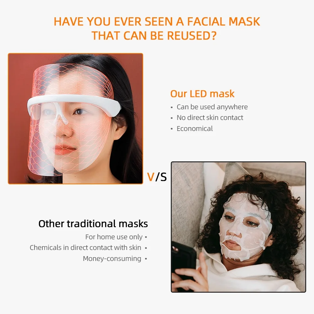 Многоразовая маска для лица. Традиционная маска для лица может использоваться только в фиксированном месте, и ее химические компоненты находятся в непосредственном контакте с кожей. Более того, его можно использовать только один раз, что делает его ежедневное использование тяжелым для всех. Для сравнения, наша светодиодный маска преодолевает эти недостатки и, следовательно, станет вашим лучшим выбором для ухода за лицом. Светодиодный Терапия.СветодиодныйМаска можетИзлучающий светильникSОпределенной длины волны. Эти огниПроникает в слой поверхности кожи ИReach Подкожный жировой слой ДляСтимулирует капиллярный поток ИУвеличение Кровообращение,Следовательно, вызываетКоллаген и эластин Для создания. В результате вашВосстановление кожи в здоровом и энергичном состоянии. Семь огней различных эффектов. Красный светильник помогает повысить глубокий ремонт и повышают эластичность кожи; Зеленый светильник может светильник RU пятна и спокойствие вашей коже; Синий светильник используется для того чтобы заблокировать бактерии и удаление акне; Розово-красный светильник' Способный повысить энергию клеток и восстановить шрам от акне; Циановый светильник улучшает метаболизм и емкость контроля масла; Оранжевый светильник ускоряет кровообращение и повышает иммунитет; Фиолетовый светильник идеально подходит для улучшения тонких линий и предотвращения провисания кожи. Управление одной кнопкой. Чем проще, тем лучше. Для этого мы удалили все ненужные кнопки, кроме одной на маске. Вам больше не придется беспокоиться о утомительных работах-всего одним щелчком вы можете завершить весь рабочий процесс. Защита глаз. В этом продукте используется нано-светильник-технология складывания. Таким образом, весь светильник не попадет прямо в глаза, а перемещается по белым линиям на маске. Таким образом, вероятность утечки на светильник значительно уменьшается, и любое возможное повреждение глаз полностью избегается. INtimate конструкции. Мы стремимся сделать эту маску удобным для пользователя продуктом, и ее интимные конструкции таковы. Блокировка без видимости: прозрачный дизайн оставляет четкое видение-вы можете включить свой телефон, телевизор или даже прочитать книгу во время всего процесса; Удобная Силиконовая носовая фиксирующая Накладка: силиконовая носовая фиксирующая накладка такая же мягкая, как и кожа. Он предотвращает вдавливание и скольжение маски и позволяет более равномерно распределять светильник; Удобная зарядка через USB: вы можете легко найти подходящий порт для зарядки-просто дайте себе лечение лица, где и когда захотите!