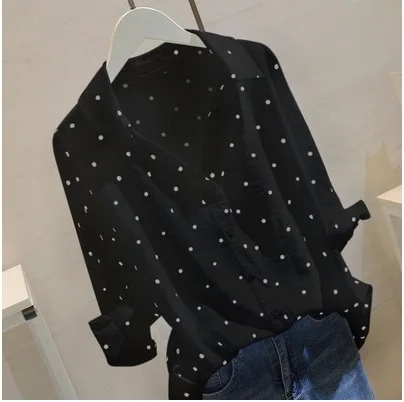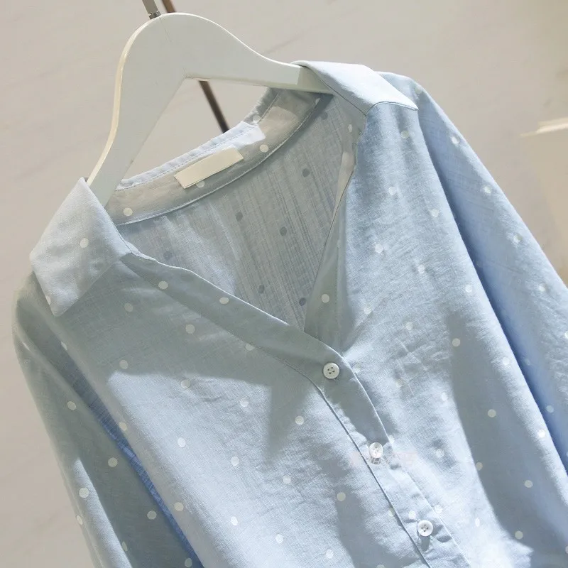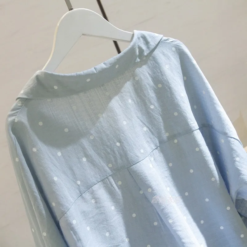Женская белая рубашка в горошек, свободная повседневная рубашка из хлопка и льна с V-образным вырезом и рукавами средней длины, лето 2021