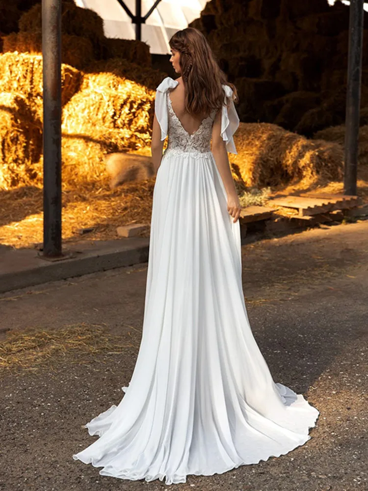 Женское свадебное платье с разрезом, белое шифоновое платье А-силуэта с кружевной аппликацией, пляжное платье невесты с V-образным вырезом, простое индивидуальное платье