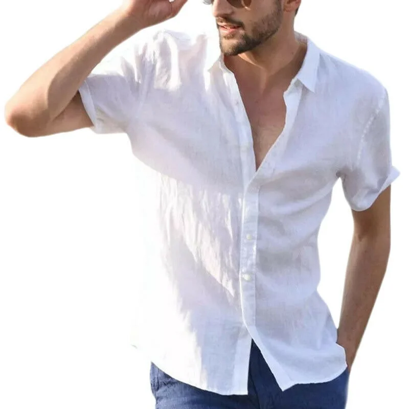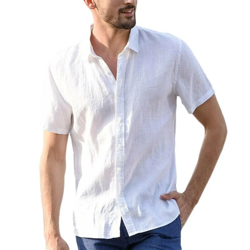 Мужская льняная рубашка с коротким рукавом, однотонная Повседневная Блузка на пуговицах, пляжный праздничный летний топ