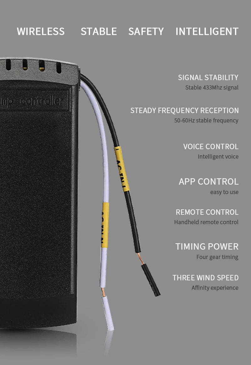 Этот продукт является переключателем, совместимым с мобильным приложением и радиочастотным пультом дистанционного управления. Радиочастотный пульт дистанционного управления может работать как безопасный Чехол без подключения к Интернету. Есть 3 провода, которые позволяют контролировать светильник и вентилятор одновременно. Он также поддерживается с 3 контролем скорости. Это действительно многофункциональный современный Умный домашний продукт.