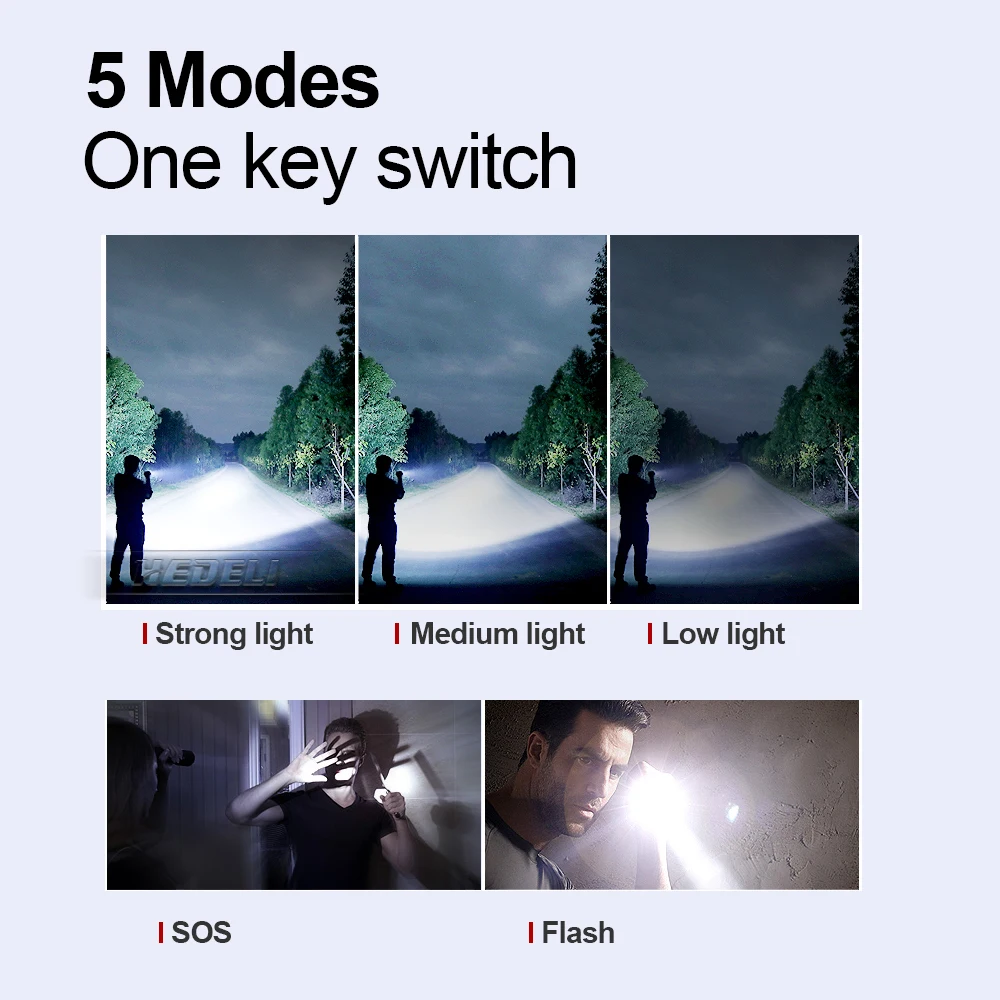 Параметры фонарикаБренд: HEDELIНазвание: фонарик XLampXHP50.2Материал корпуса: алюминиевый сплавМатериал линз: выпуклая линзаЦвет излучения: белый светильникВодонепроницаемость: IPX-6Вес: 207 гДиапазон: 300 - 800 мРазмер: 168 мм × 42 мм × 33 ммРежим переключения: 100%-70%-50%-вспышка-SOSТип батареи: 18650 или 26650Зарядное устройство: Micro usb,Компьютерный USB, Автомобильный USB