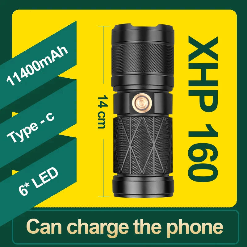 Название: мощный светодиодный фонарикСветильник: XHP160 светодиодный,Размер: 14 см * 5,2 см * 5 смВес: 435 гМатериал линз: выпуклая линзаЦвет излучения: белый светильникРежимы: 5 режимов (сильный-средний-низкий-вспышка-SOS)Водонепроницаемость: IPX6 (срок службы водонепроницаемый, не может быть помещен в воду в течение длительного времени)Режим масштабирования: телескопический зум (увеличение, уменьшение зума)Аккумулятор: встроенный аккумулятор емкостью 11400 мАч (может использоваться в качестве внешнего аккумулятора)Способ зарядки: Micro USB зарядка (TYPE- C)Подходит для альпинизма, охоты, кемпинга, работы, учебы, ночной езды, предупреждения, патруля, поиска и спасения и т. д.
