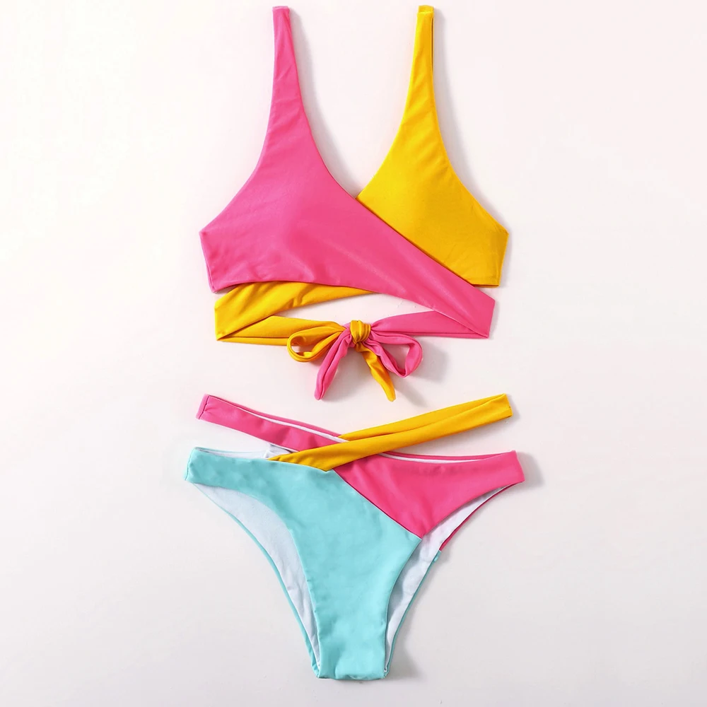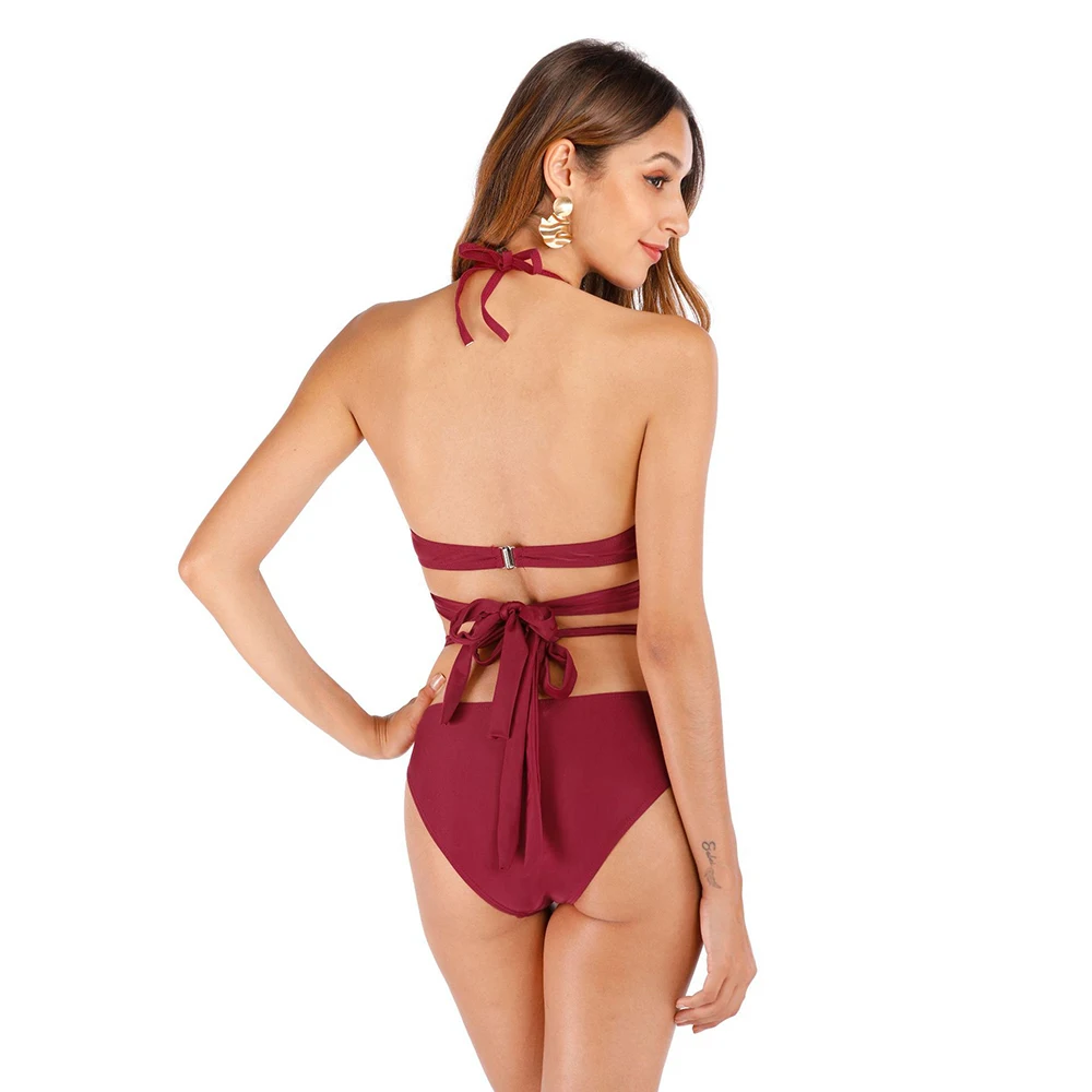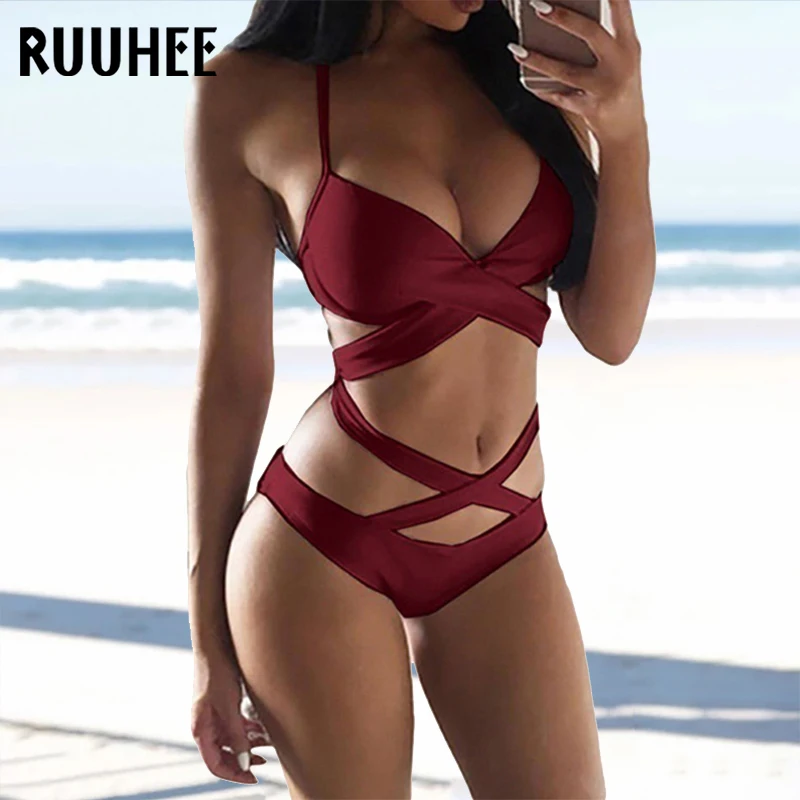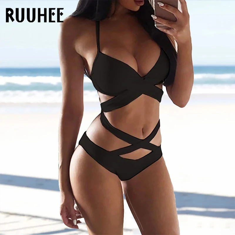 Купальный костюм RUUHEE Женский, перекрестный купальный костюм, сексуальная пляжная одежда, однотонные комплекты бикини, бикини с высокой талией, пуш-ап, 2021