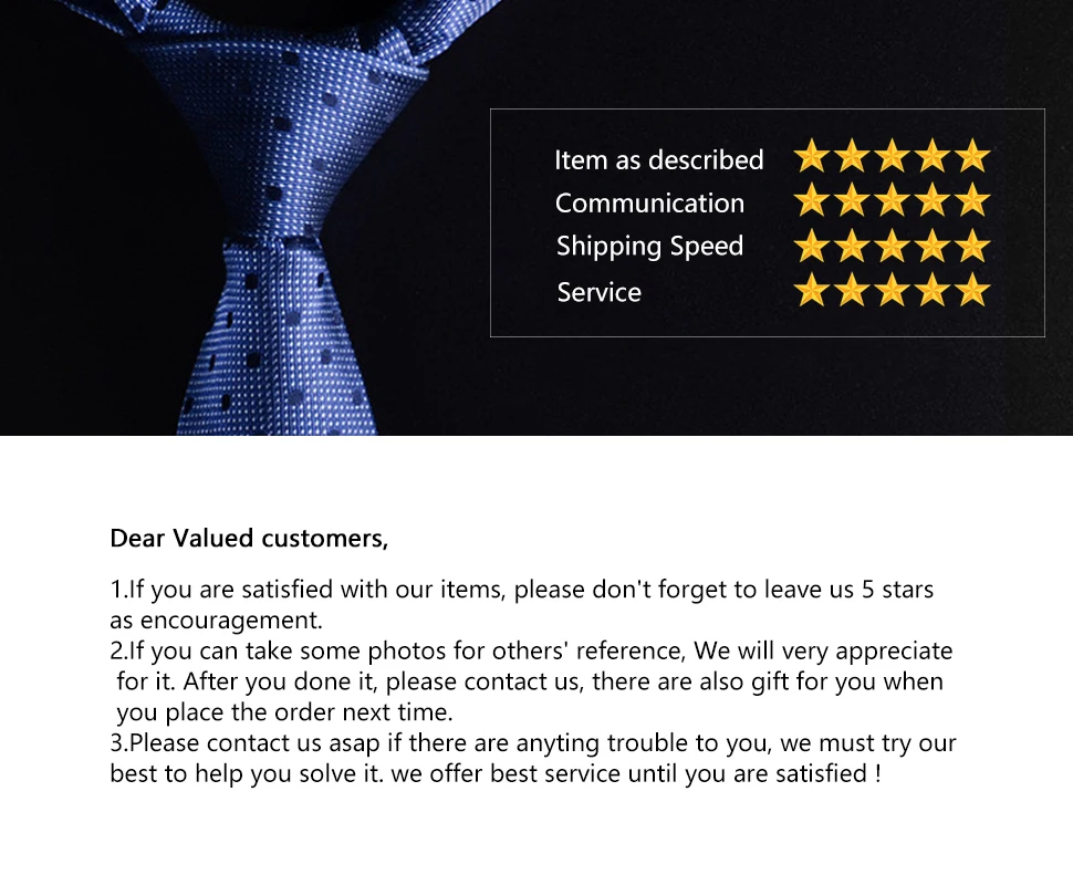 Мы здесь, чтобы ответить на все ваши вопросы. Ваше удовлетворение очень важно для нас, не стесняйтесь, напишите нам, если у вас есть какие-либо вопросы о наших товарах, и мы ответим как можно скорее. (в течение 24 часов)Наше рабочее время: с 9 до 6 (с понедельника по пятницу, за исключением праздников); Пожалуйста, поймите разницу во времени между нашими нациями, мы находимся в Китае, наше настоящее время показано ниже:Наше время = время PDT + 15 часов, = время UTC + 8 часов, = время BST + 7 часовПолезные советы:Неправильное обращение с ценными шелковыми галстуками разрушит их внешний вид. Аккуратно завяжите узел и расстегните галстук. Пусть отдыхают после дня носки. Складки легко снимаются, держа галстук за узкий конец, катая его вокруг кулака, тогда это была команда. Получите химчистку, так как это может повредить ваши галстуки. Конечно, лучше иметь много галстуков, так что Чистка не требуется.