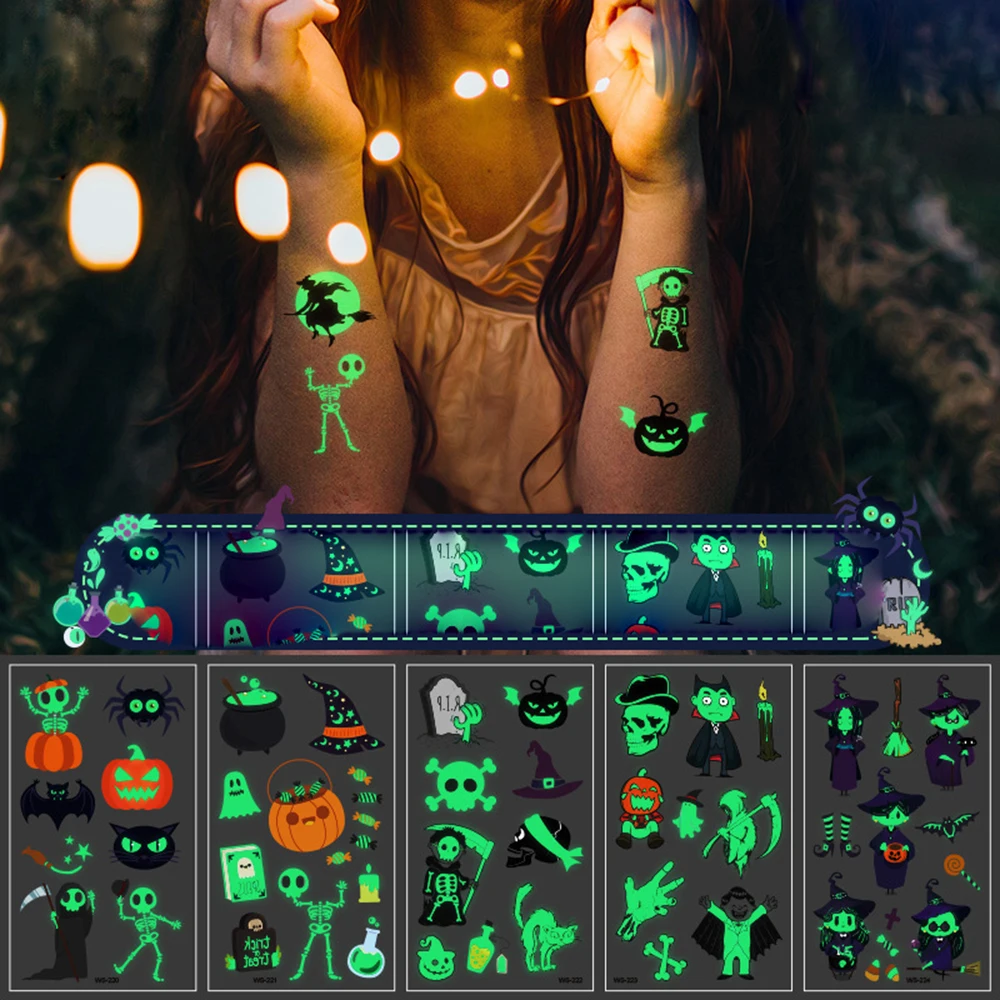 Новая светящаяся татуировка на Хэллоуин, водостойкая мультяшная флуоресцентная лицевая рука, Череп, тыква, временные наклейки для детской вечерние, игрушка