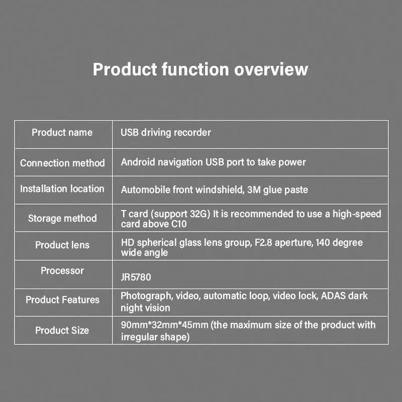 Спецификация: Название продукта: USB-Регистратор ADAS Цвет изделия: серебристо-серый Материал корпуса: алюминиевый материал Размер продукта: 90 мм * 32 мм * 45 мм (нестандартный размер занимает наибольшее значение) Чип продукта: Lingtong Датчик светильник ности: H66 Модель передней линзы: 2719 (4G) Широкий Угол объектива: широкий угол 140 ° Диафрагма объектива: F2.0 Частота кадров видео: 30 кадров в секунду Формат записи видео файла: AVI Разрешение видео: 1080P Формат фотофайла: JPG Формат кодирования видео: MPEG Температура хранения: (-20 ℃-60 ℃) Рабочая температура: (-10 ℃-55 ℃) Рабочая Влажность: 15%-60% относительной влажности Режим питания: Интерфейс Android USB Языковая поддержка: поддержка китайского, английского, русского, тайского, вьетнамского и нескольких языков Метод хранения: TF-карта (8-32 Гб) рекомендуется использовать карты памяти класса 10 выше Циклическая запись: Поддержка Комплектация: диктофон * 1, USB-кабель * 1, руководство * 1 Вес посылка: 190 г