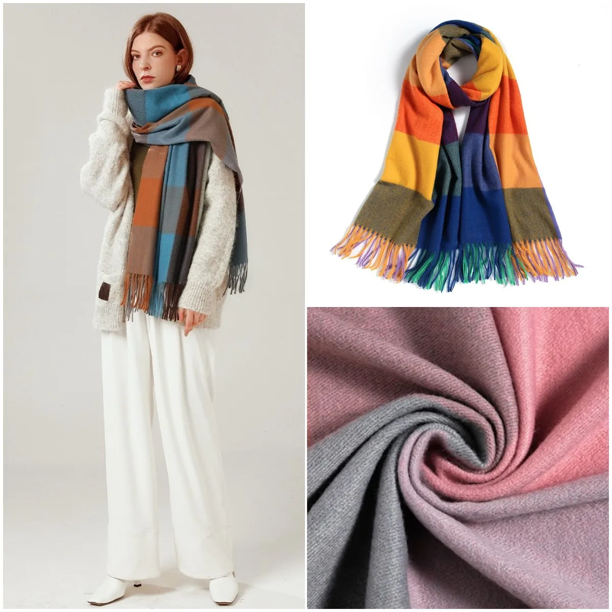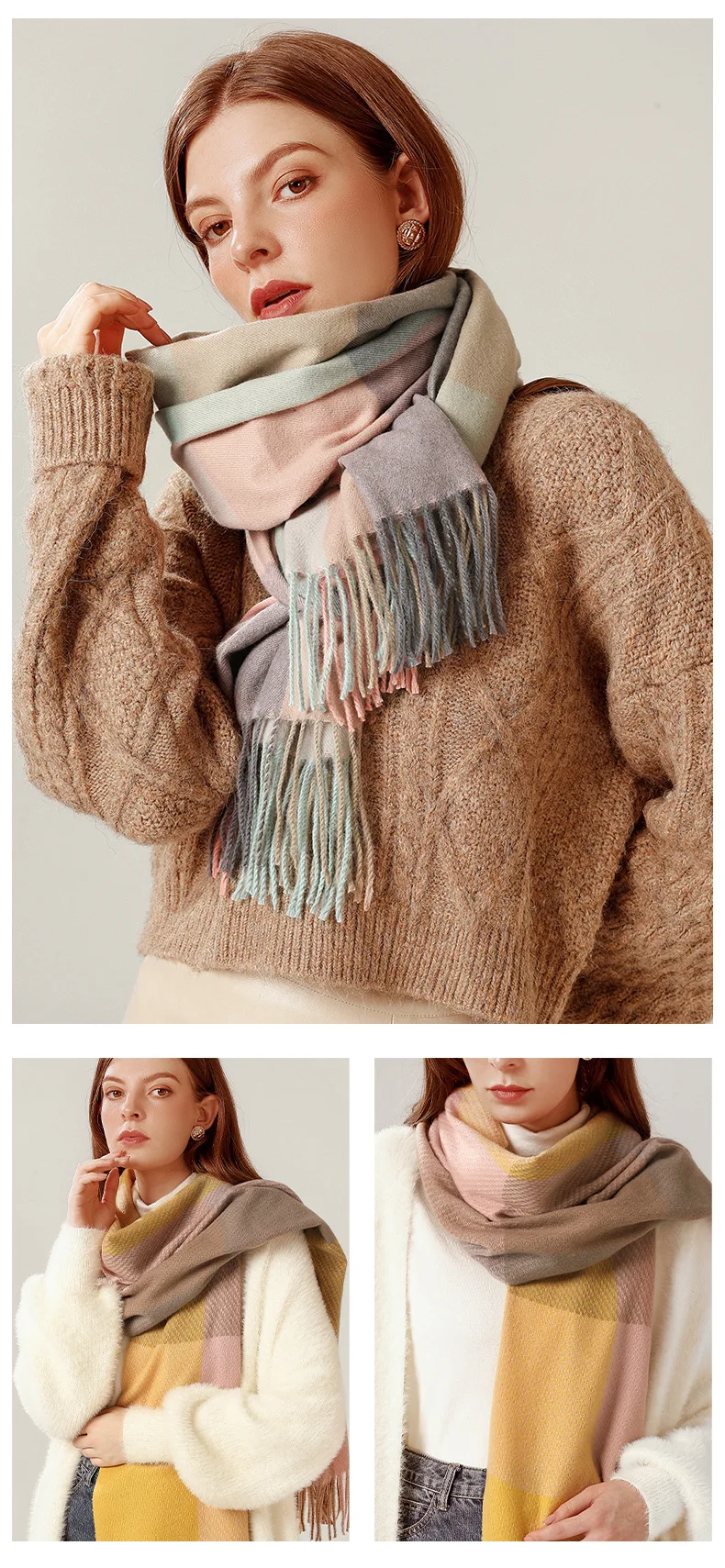 Зимний клетчатый шарф, женская теплая шаль из пашмины, длинные вяза...