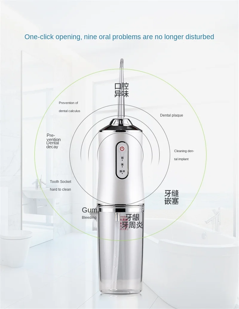 Водяной поплавок небольшой и портативный, он позволяет легко чистить труднодоступные области и предотвратить карикатура, зубной налет, зубной камень, кровотечение десен и гиперчувствительность зубов. Он имеет три режима, нормальный режим: стандартное давление воды, Эффективная очистка. Деликатный режим: нежное давление воды, нежное прикосновение. Импульсный режим: сильное давление воды, глубокая очистка.