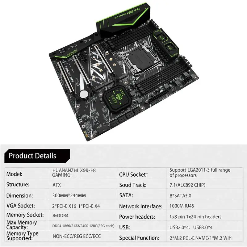 LX0B huanzhi X99-F8 игровая материнская плата для In-tel X99 LGA2011-3 все серии DDR4 RECC 128 ГБ M.2 NVME USB3.0 серверОписание:100% новый и высокое качествоХарактеристика:Модель материнской платы предназначена для X99-F8 HUANANZHI. Южный мост X99.Материнская плата без аккумулятора CMOS.Пожалуйста, убедитесь, что вы покупаете правильную плату для совместимости другого оборудования.Слот памяти, отмеченный 1, является основным слотом, а отметка 2-дополнительным слотом, который должен быть вставлен в главный слот.Характеристики:Тип товара: материнская платаБренд: Huananzhi X99-F8ЦП гнездо: Поддержка LGA2011-3 полный спектр процессоровЗвуковая дорожка: 7,1 (чип ALC892)SATA: 8xSATA3.0Гнездо VGA: 2xPCI-E X16, 1xPCI-E X4Сетевой интерфейс: 1000 м RJ45Разъем памяти: 8xDDR4Заголовки питания: 1x8pin 1x24pin заголовкиМаксимальная емкость памяти: DDR4 1866/2133/2400 128G(32G каждый)USB: USB2.0x4 USB3.0x4Поддерживаемый Тип памяти: NON-ECC/REG ECC/ECCСпециальная функция: 2xM.2 PCI-E NVME/1xM.2 WiFiМатериал: печатная платаРазмер: 300x24 4 мм/11.8x9.6 дюймовЦвет: черныйКоличество: 1 шт.Примечание:Перевод ед. измерения: 1 см = 10 мм = 0,39 дюймовВозможны отклонения в 0-1 см вследствие измерений вручную. Пожалуйста, убедитесь, что вы не возражаете, прежде чем сделать ставку.Из-за разницы между различными мониторами изображение может не отражать фактический цвет изделия. Спасибо!Посылка включает в себя:1 х материнская плата