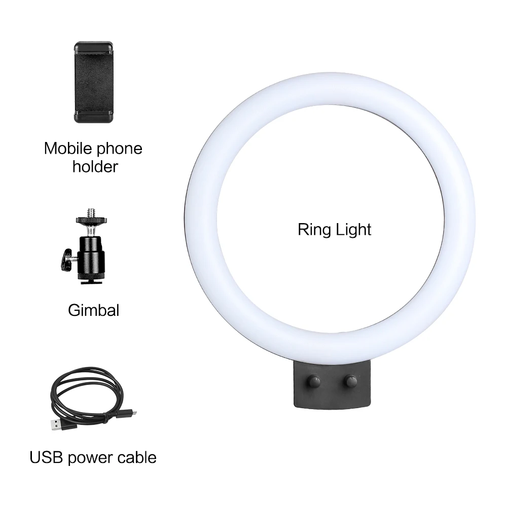 1 х 9 дюймов кольцевой светильник1x8,5 см Настольный ШтативЧерный штатив 1x17 см1 x зажим для телефонаШаровая Головка-1 шт.Кабель питания от USB-1 шт. (2,5 метров в длину)