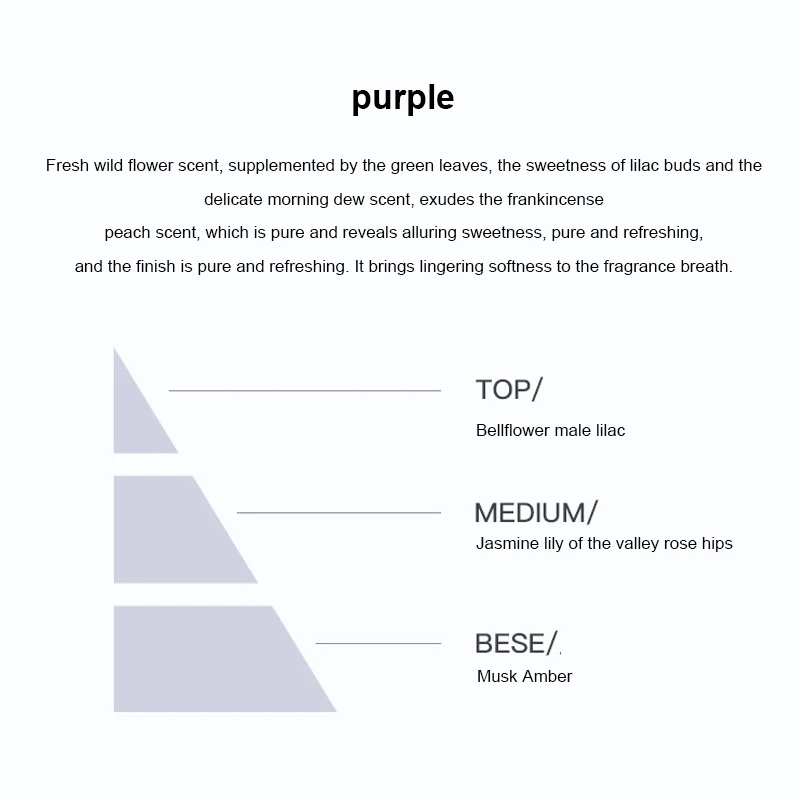 * Фиолетовый Колокольчик ветра (zumalong blue wind chime с ароматом): свежий аромат диких цветов, дополненный зелеными листьями, сладким бутоном гвоздики и деликатной утренней росой, отслаивающий аромат персика, чистый и привлекательный, сладкий, чистый и освежающий, отложите окончание, привнесите сохраняющий мягкий аромат.