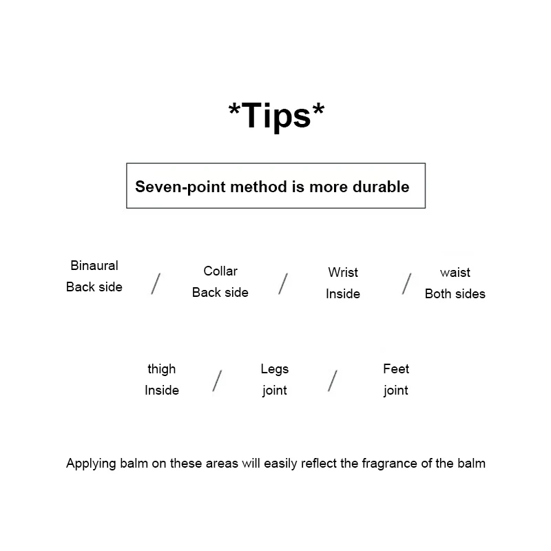 * Метод семи точек Более долговечен: за ушами, задней частью шеи, внутренней частью запястья, сторонами талии, внутренней частью бедра, суставы ног и суставы лодыжки. Нанесение мази на эти части будет легко отражать аромат мази.