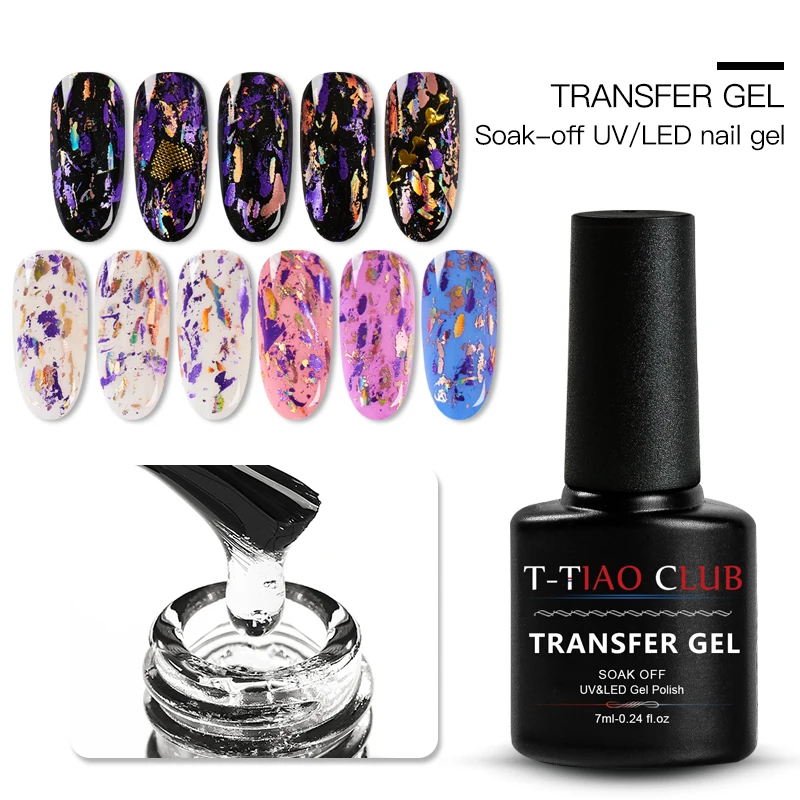 Спецификация:* Объем: 7 мл* Цвет: прозрачный* Сертификация: MSDS, SGS* Тип: снимается замачиванием УФ-Гель-лак, необходимо использовать с топовым базовым покрытием, сушить УФ светодиодный Ной лампойОсобенности:* Идеально подходит для создания собственного красивого дизайна ногтей на пальцах или ногах;* Подходит для использования с другими продуктами для нейл-арта;* Может использоваться на искусственных и натуральных ногтях;* Краски можно использовать на разных поверхностях, таких как ногти, бумага и другие предметы искусства;* Подходит для профессионального или домашнего использования.* Посылка1 шт. Гель-лак для ногтейКак снять:1. Замочите ногти в жидкости для снятия акрила примерно на 5 минут.2.-аккуратно разделите целый кусок эмали на каждый ноготь.Как использовать:1. Подготовьте ногтевую ложку, придавая ей форму, отодвигая кутикулу и удаляя все масла.2. Нанесите Базовое покрытие и высушите его под УФ/светодиодной лампой.3. Нанесите Гель-лак для ногтей (лучше темный цвет), высушите его под УФ/светодиодной лампой.4. Нанесите переводной клей для ногтей и подождите, пока станет прозрачно.5. Отрежьте кусок фольги (достаточно большой для ногтя) и прижмите к ногтю. На ногтях могут смешиваться фольги разных цветов.5. Удалите фольгу, и рисунок фольги должен прилипнуть к вашему ногтю. Если немного не хватает, просто нанесите верхнее покрытие на не снятую часть и повторите шаг 4.6. После полного высыхания закройте его верхним слоем, чтобы защитить фольгу.