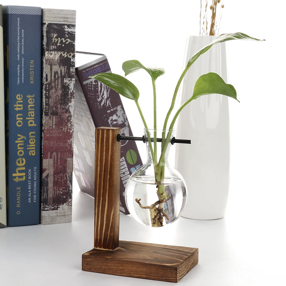 Креативная гидропонная ваза с деревянной рамкой, прозрачный стеклянный контейнер для цветов с зелеными растениями, настольное украшение для дома