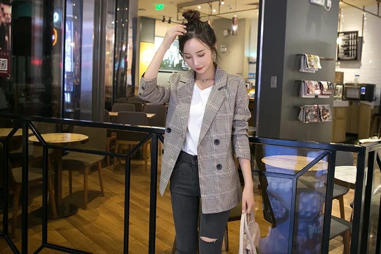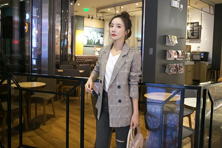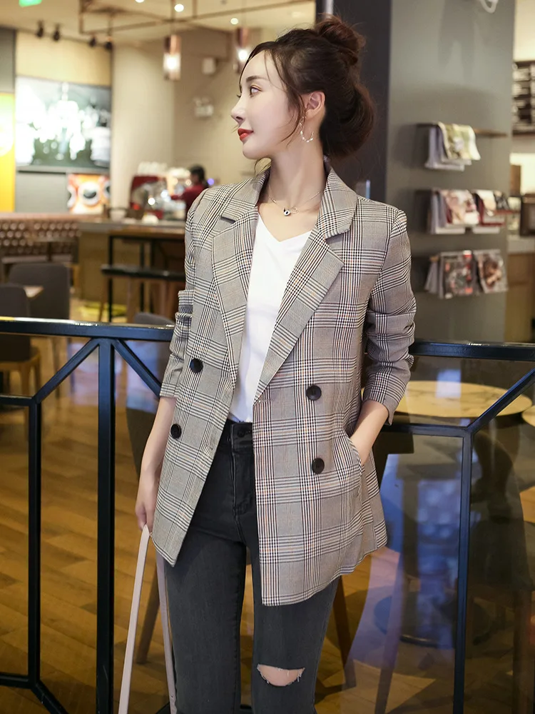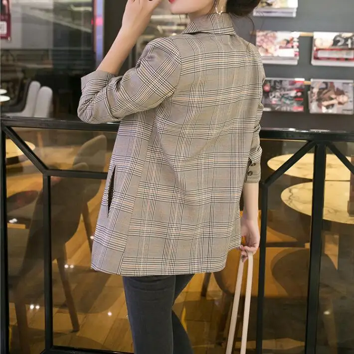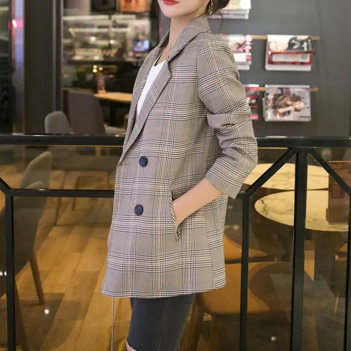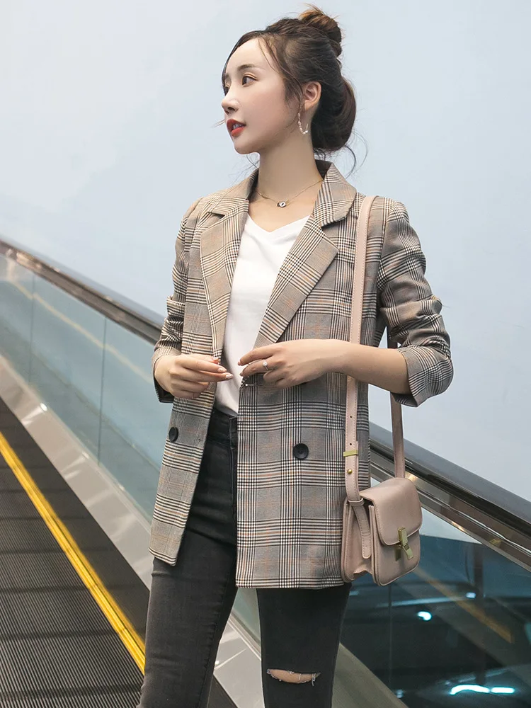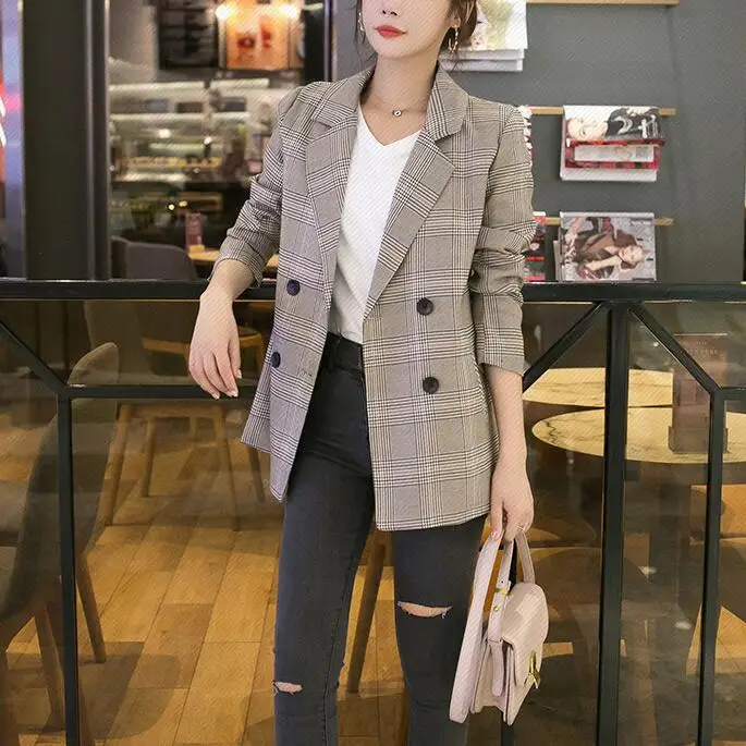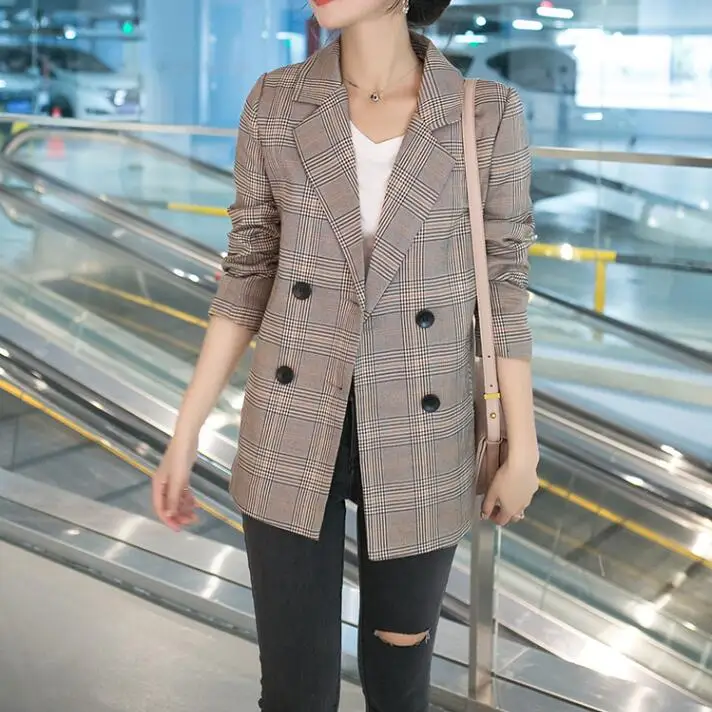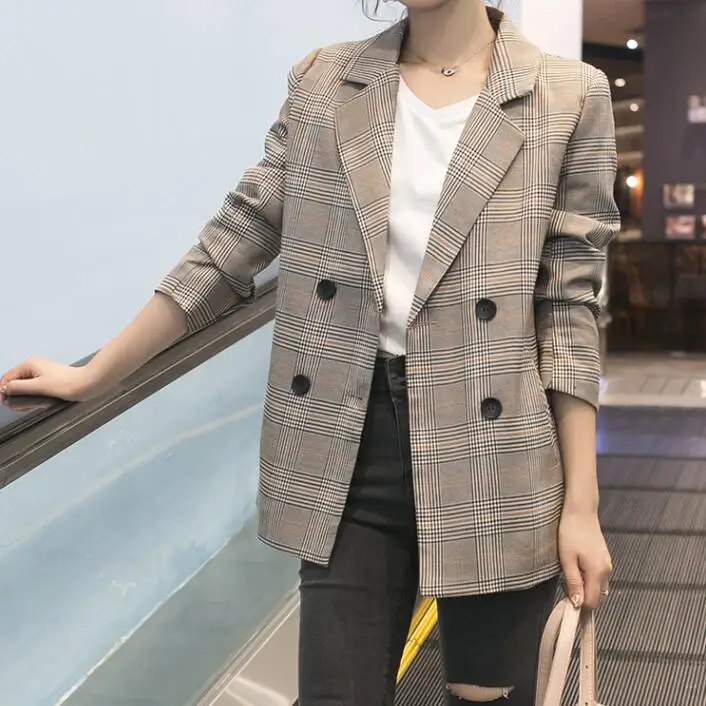 Женский Повседневный блейзер в клетку, двубортный пиджак с отложным воротником и длинными рукавами, элегантная верхняя одежда, 2021