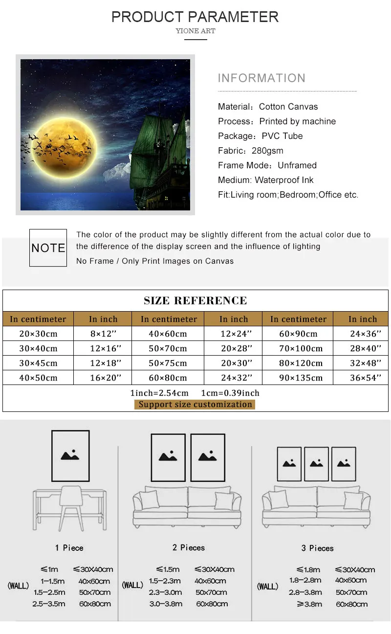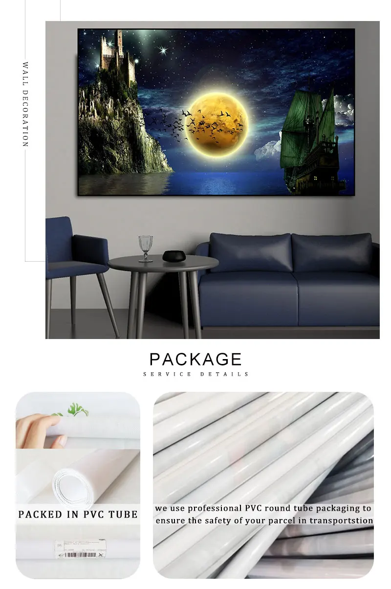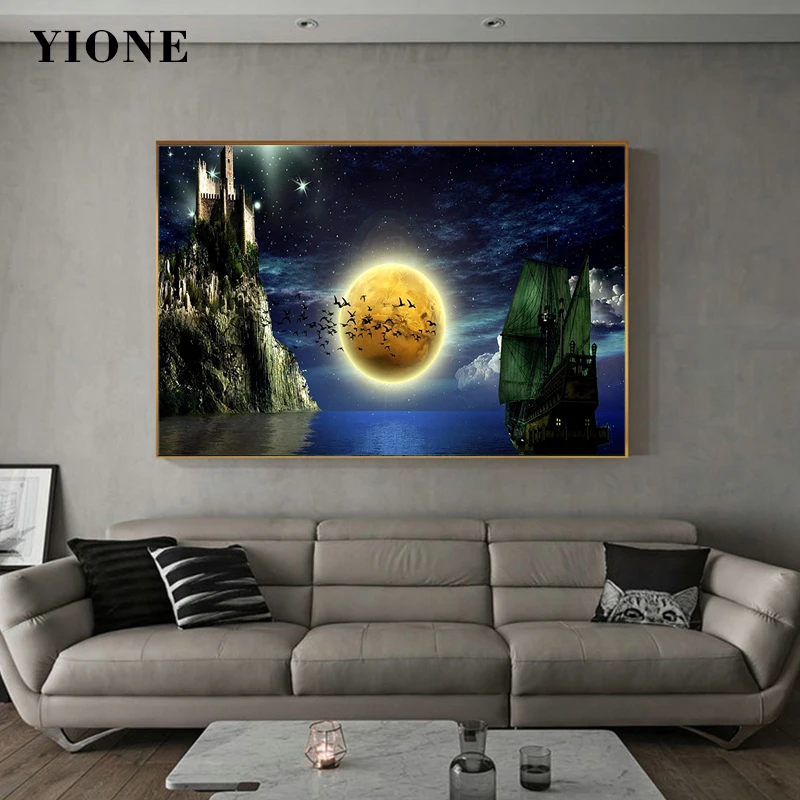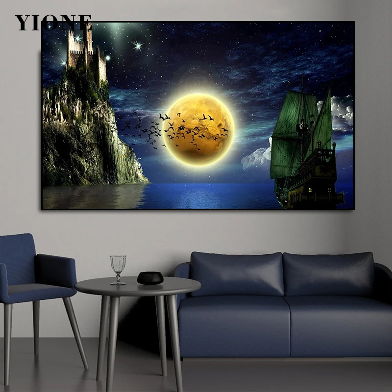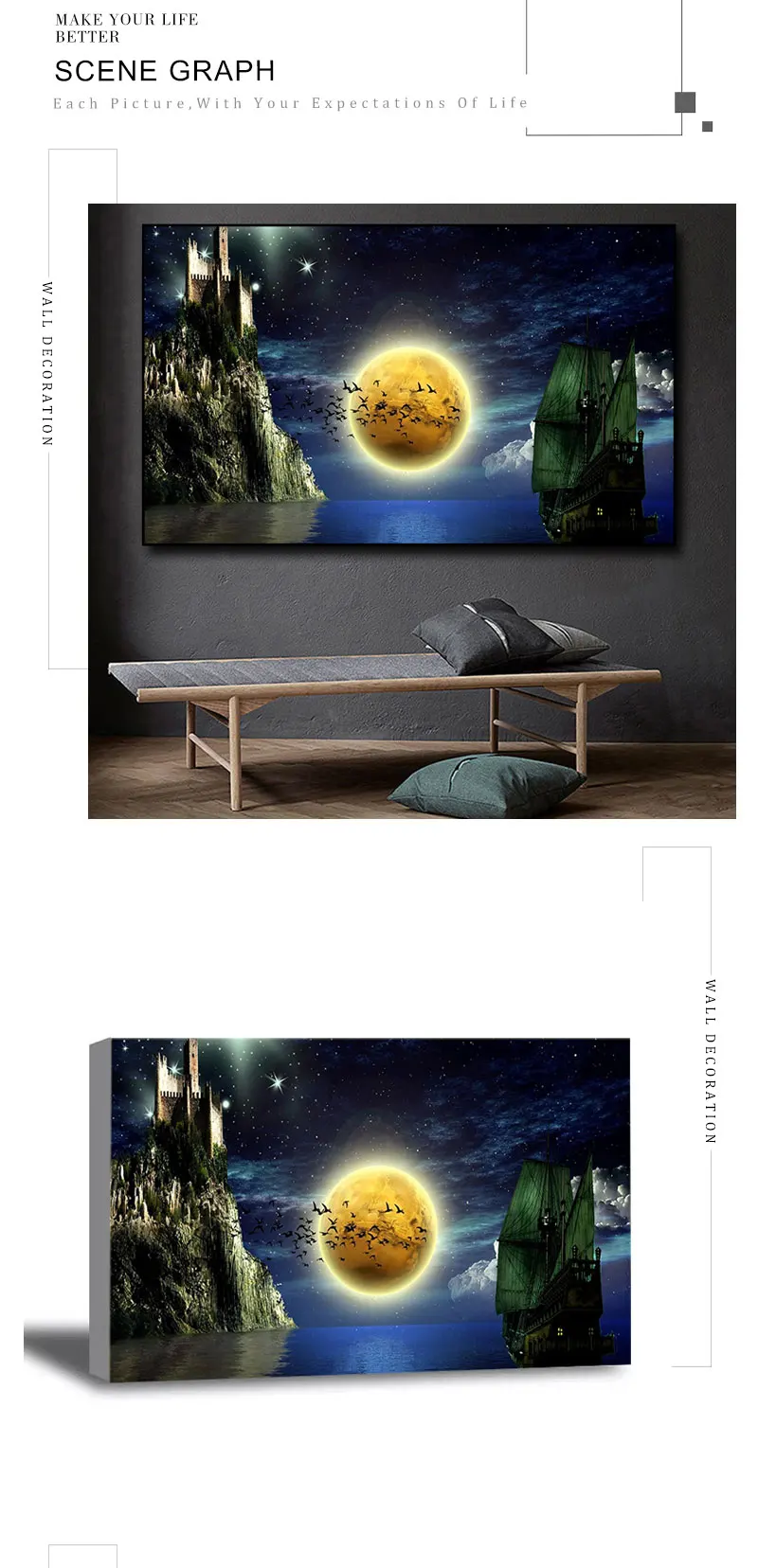 Настенный постер с изображением темного парусника, замка, луны, звездного неба, моря