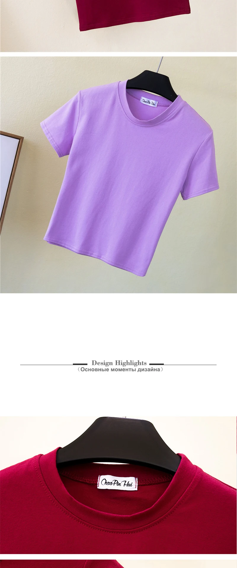 Хлопковый укороченный топ, женская одежда, однотонная уличная одежда с круглым вырезом, футболка с коротким рукавом, базовая футболка в стиле Харадзюку, Летняя женская одежда