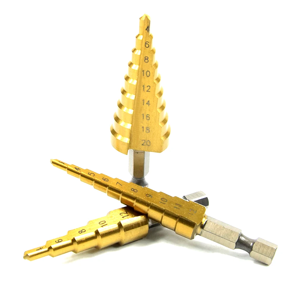 Сверла из быстрорежущей стали с титановым покрытием, ступенчатые, с шестигранным сердечником, 3-12 мм, 4-12 мм, 4-20 мм