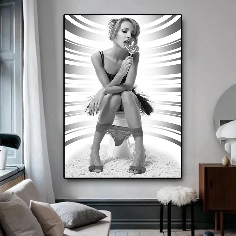 Девочка ест леденец на палочке, холст для живописи Черный и белый портретный плакат и принты стены искусства для современного Гостиная Домашний декор росписи