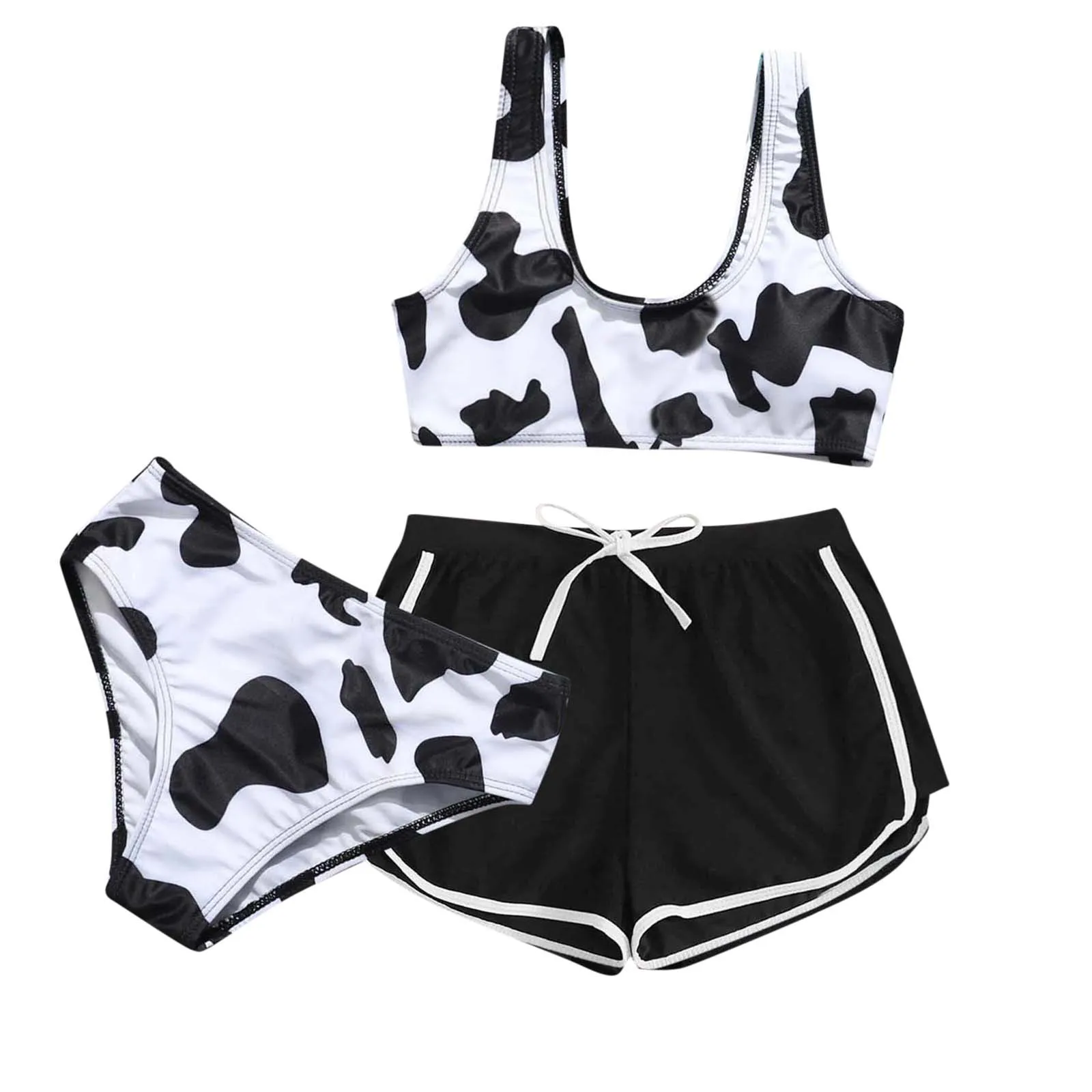 TELOTUNY, одежда для плавания для девочек, Новинка лета 2021, милый купальник из трех предметов с принтом коровы, перекрестной спиной и цветочным принтом, комплект бикини для женской одежды