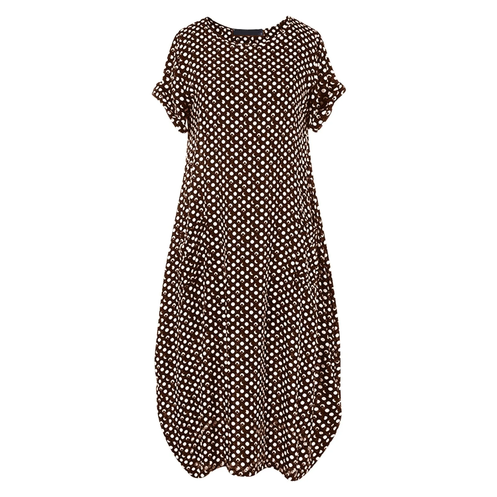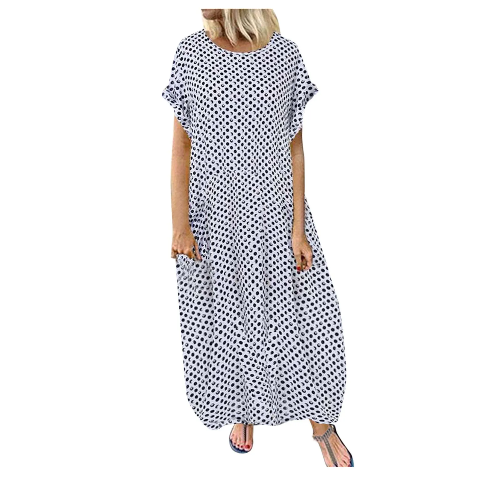 Винтажный Свободный Прямой сарафан, длинное повседневное женское платье макси в горошек с коротким рукавом и круглым вырезом, пляжные богемные платья