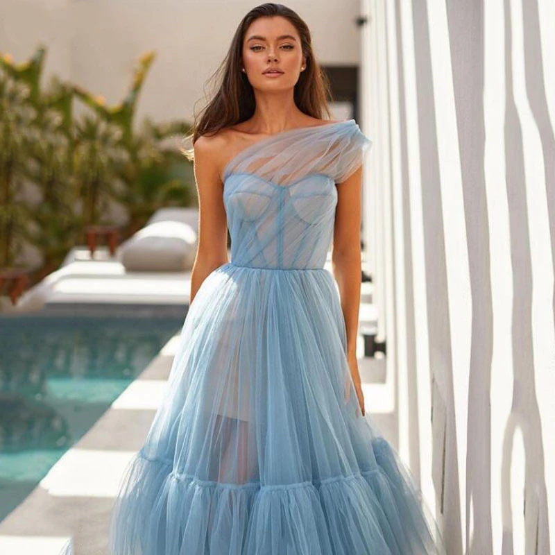 Платье для выпускного вечера длиной ниже колена 2022 пыльно-голубое Плиссированное элегантное Тюлевое ТРАПЕЦИЕВИДНОЕ короткое вечернее платье с одним открытым плечом на заказ