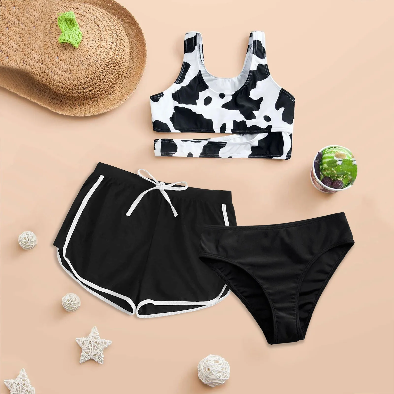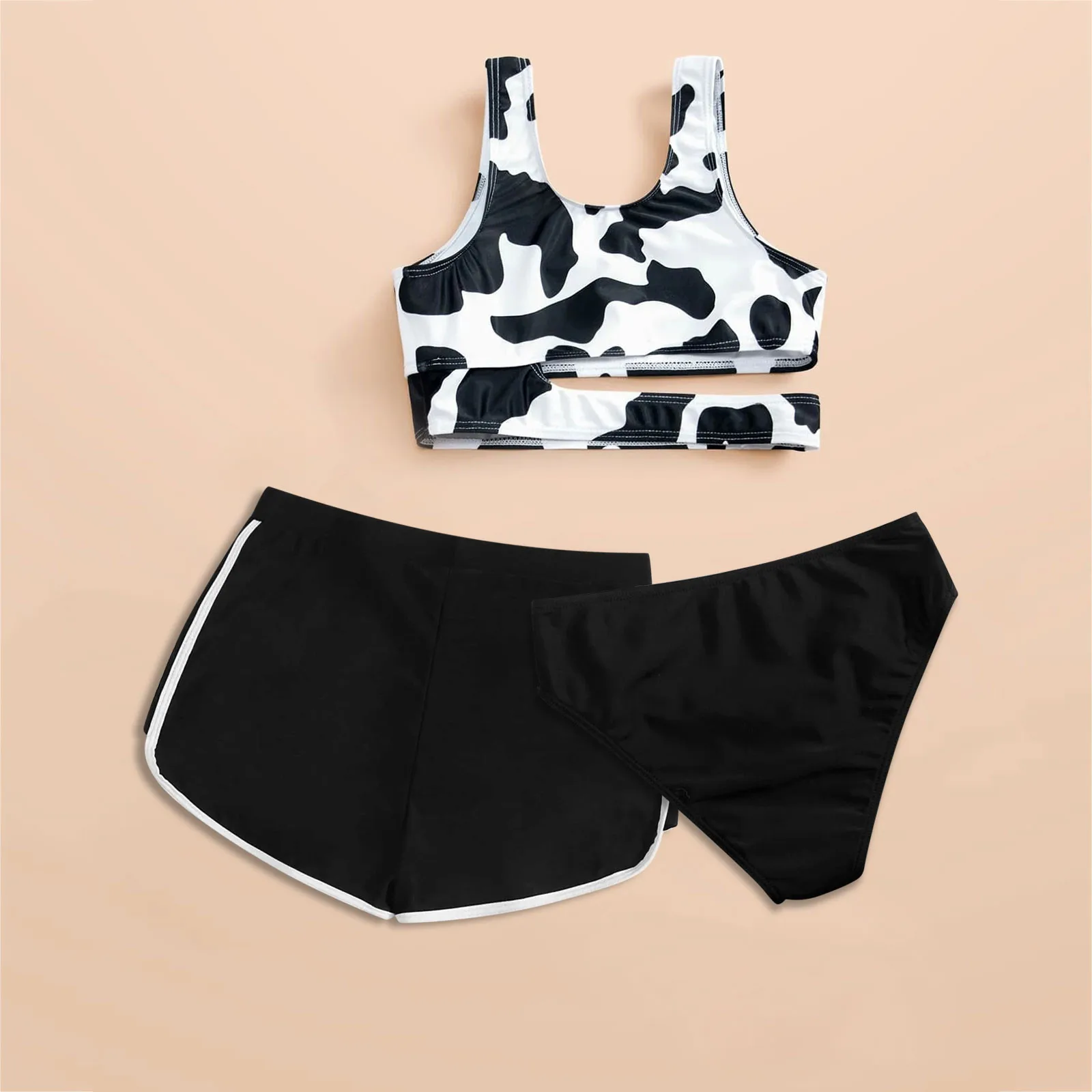 Купальник TELOTUNY для девочек, Летний милый купальник из трех частей с коровьим цветочным принтом и перекрестной спинкой, комплект бикини, пляжная одежда для бассейна, женская одежда