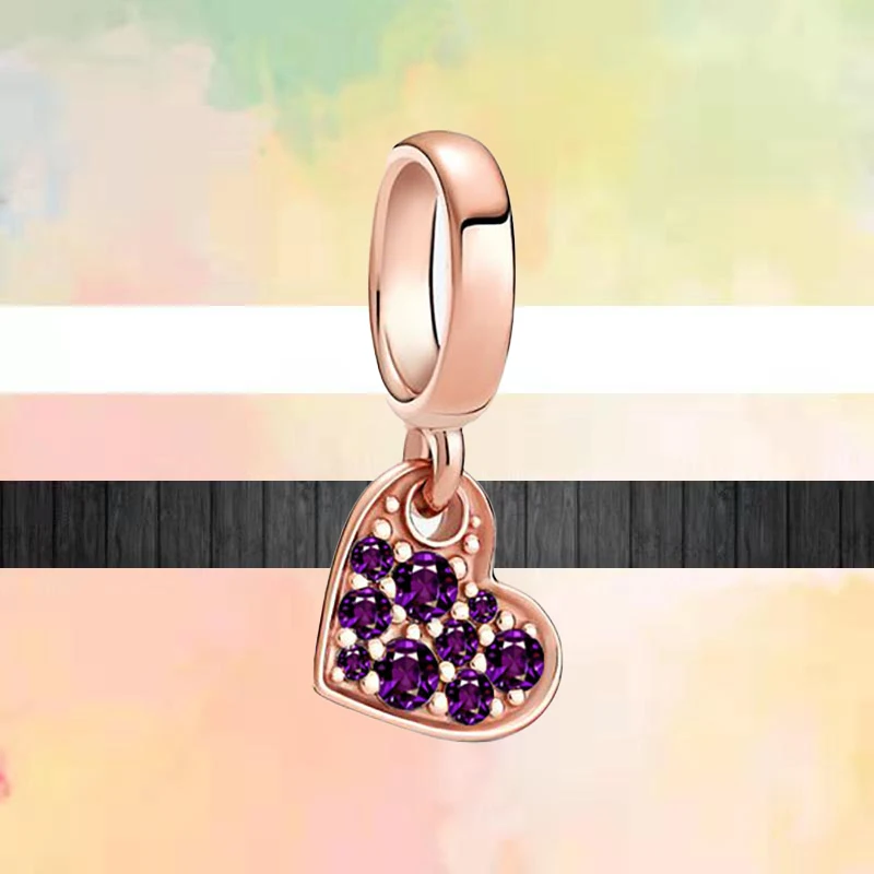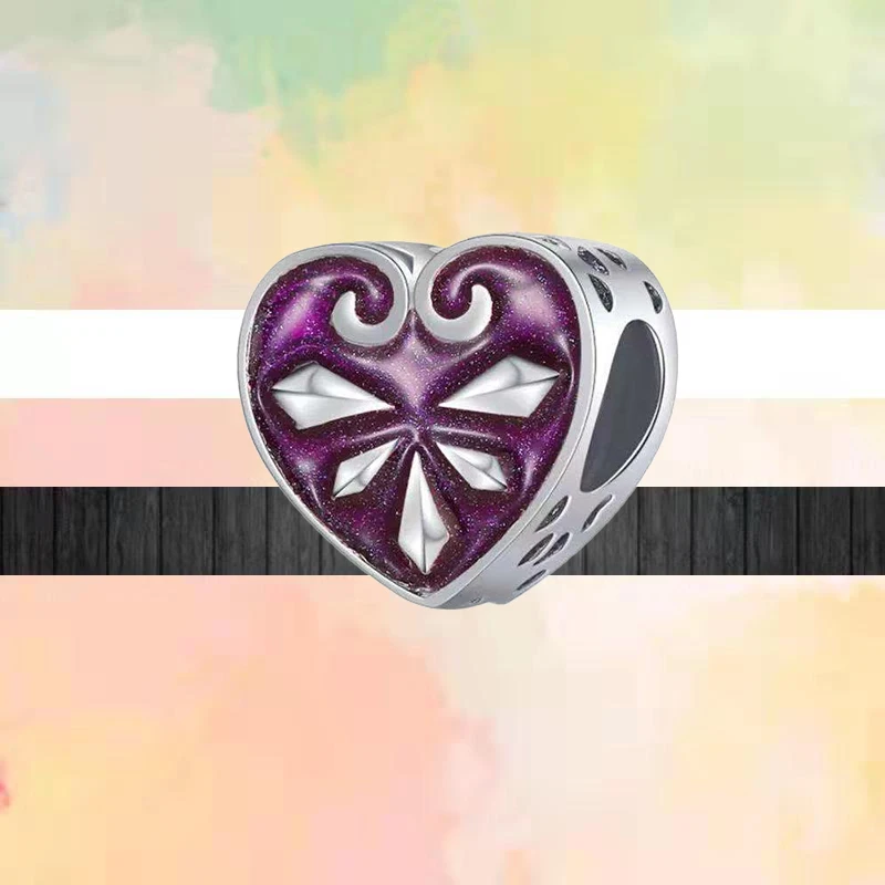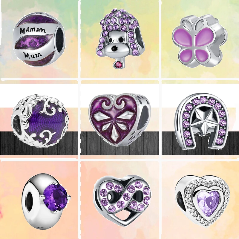 Лидер продаж, фиолетовые бусины из серии с ручной росписью, бабочки, сердечки, подходят к оригинальным шармам Pandora, серебряный браслет, Женские Ювелирные изделия