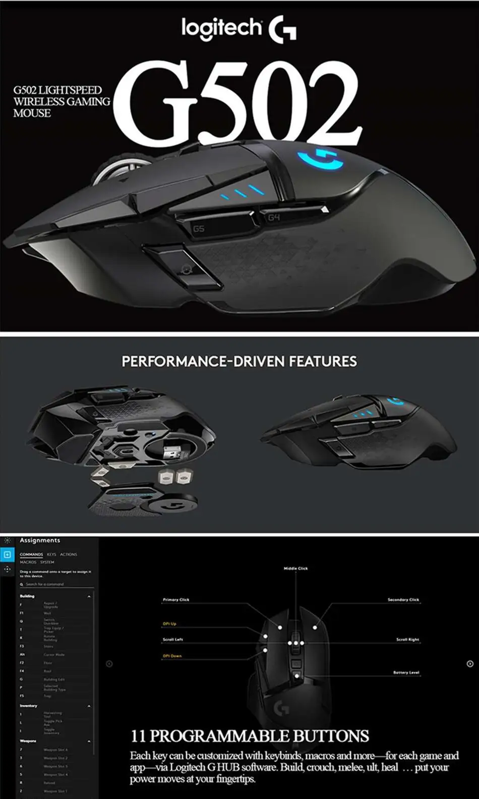 Бренд: Original LogitechМодель: Logitech G502 HEROПодключение: проводное USBРегулируемый ВесКнопка регулировки: 11Свет может быть отрегулированоСенсор: HEROРазрешение: 100-25600DPIМаксимум. Скорость:> 400IPSНулевое сглаживание/Ускорение/фильтрацияМаксимум. Ускорение:> 40 гВес: 250,00 гЦвет: черныйБренд: Original LogitechНазвание продукта: Logitech (G) G502 LIGHTSPEEDПодключение: беспроводноеИсточник питания: перезаряжаемыйРегулируемый ВесРегулируемая кнопкаСвет может быть отрегулированоСенсор: HEROРазрешение: 100-25600DPIМаксимум. Скорость:> 400IPSНулевое сглаживание/Ускорение/фильтрацияМаксимум. Ускорение:> 40 гВес: 200,00 гВес брутто продукта: 200,00 гПодсветка: RGBПрограммируемые клавиши: 9 или болееРежим подключения: мульти-режимЦвет: черный