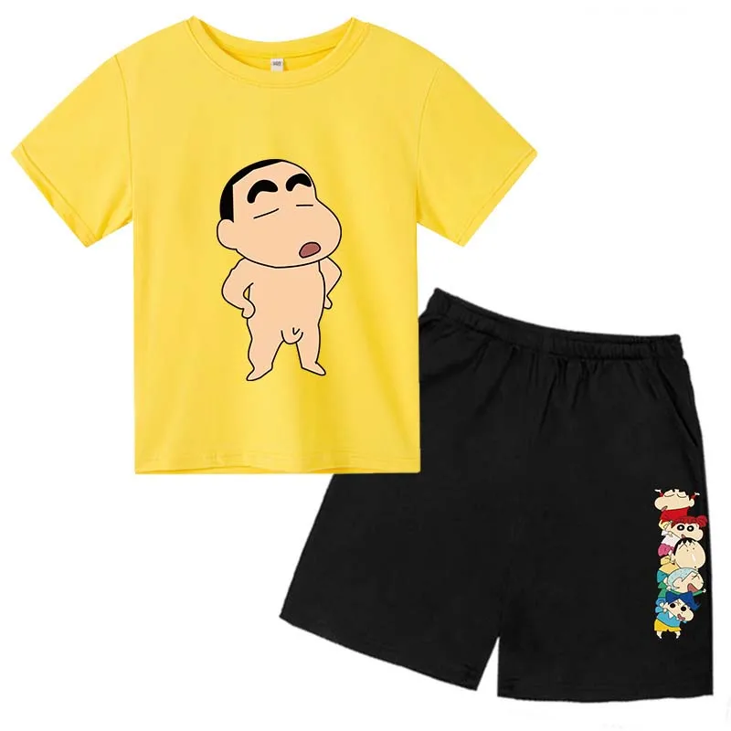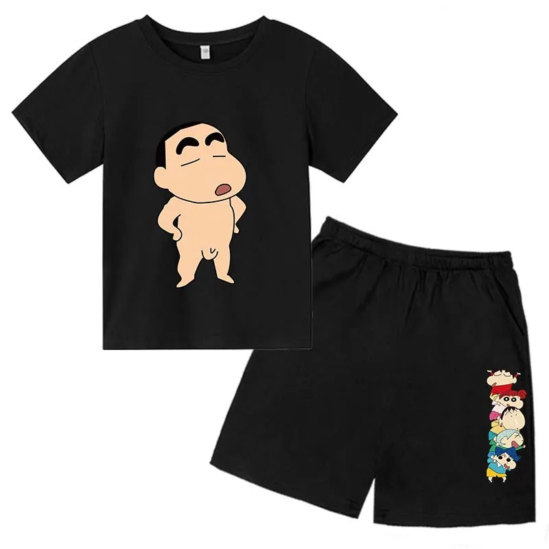 Детский хлопковый комплект с шортами, футболка и штаны с мультяшным принтом Shin Chan, комплект из 2 предметов для мальчиков и девочек, детские Топы с коротким рукавом, милая детская одежда