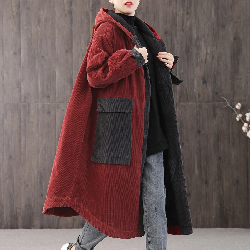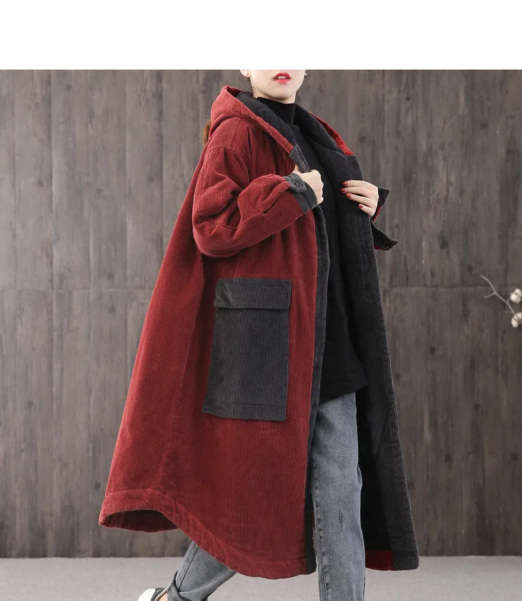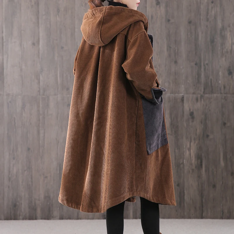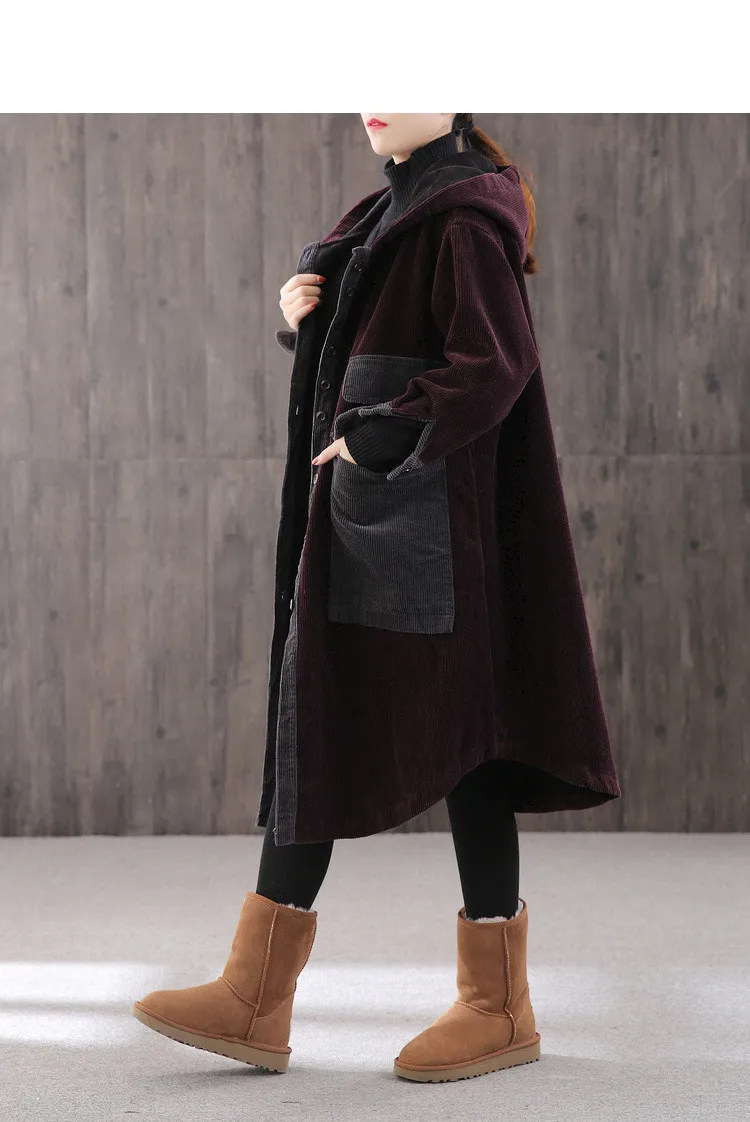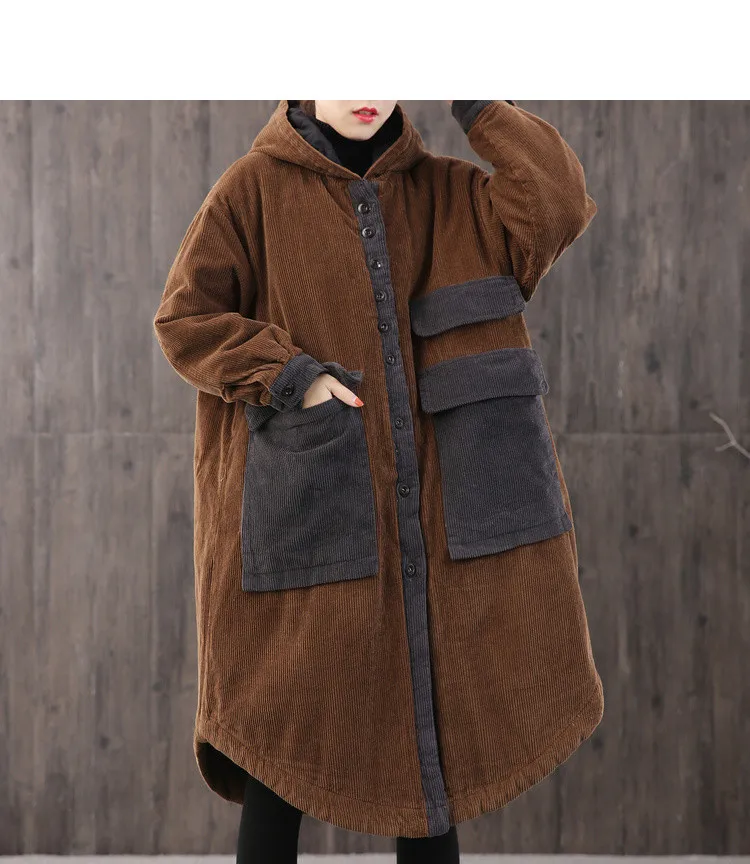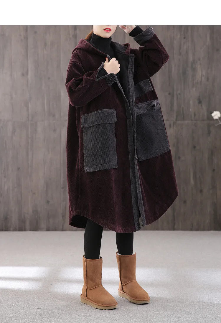 Женская Вельветовая куртка с капюшоном, длинная свободная куртка с большими карманами и хлопковой подкладкой, парка на осень и зиму