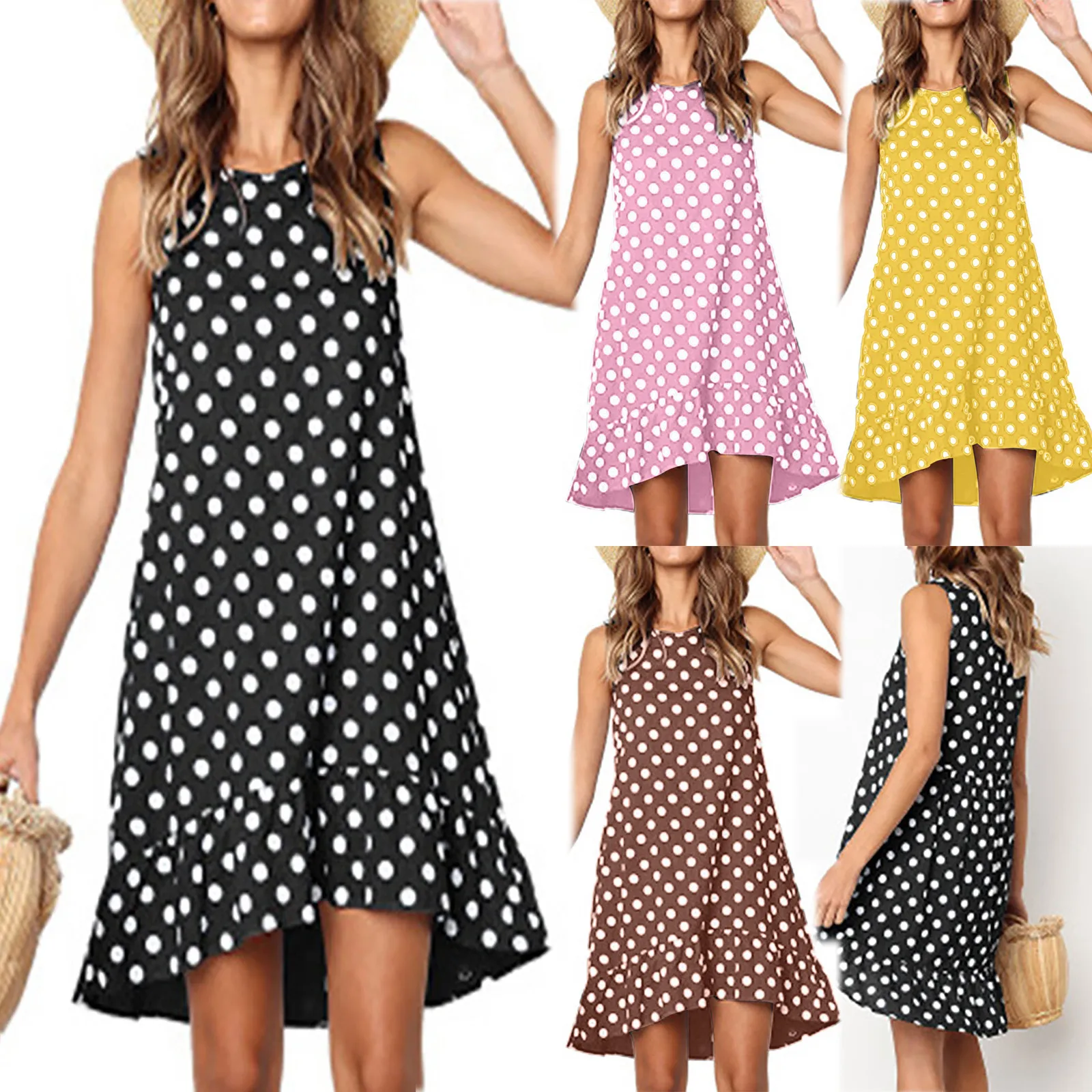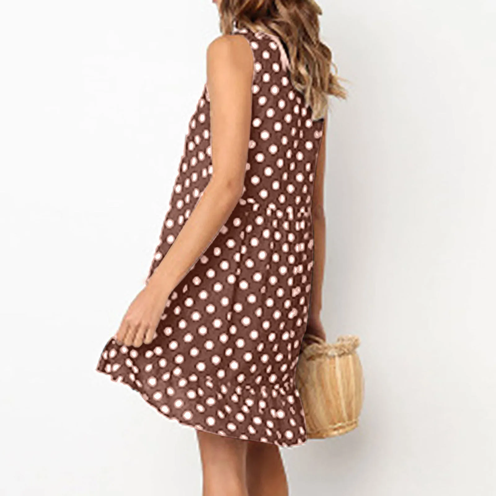 Женское летнее Свободное платье в горошек без рукавов с оборками и круглым вырезом и карманами