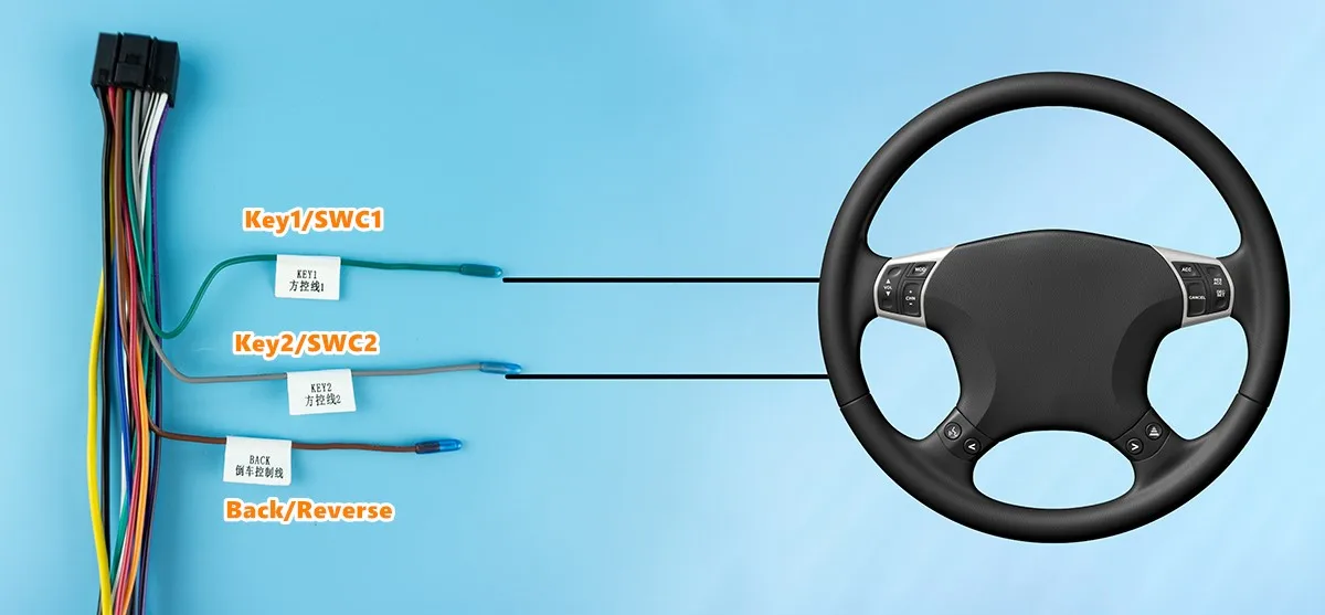 1 】⃣Пожалуйста, подключите кабель управления рулевого колеса к SWC-кабелю.2 ②⃣Удерживайте кнопку на руле и нажмите значок функции на экране, чтобы соответствовать. Цвет кнопки на экране изменится после успешного совпадения.