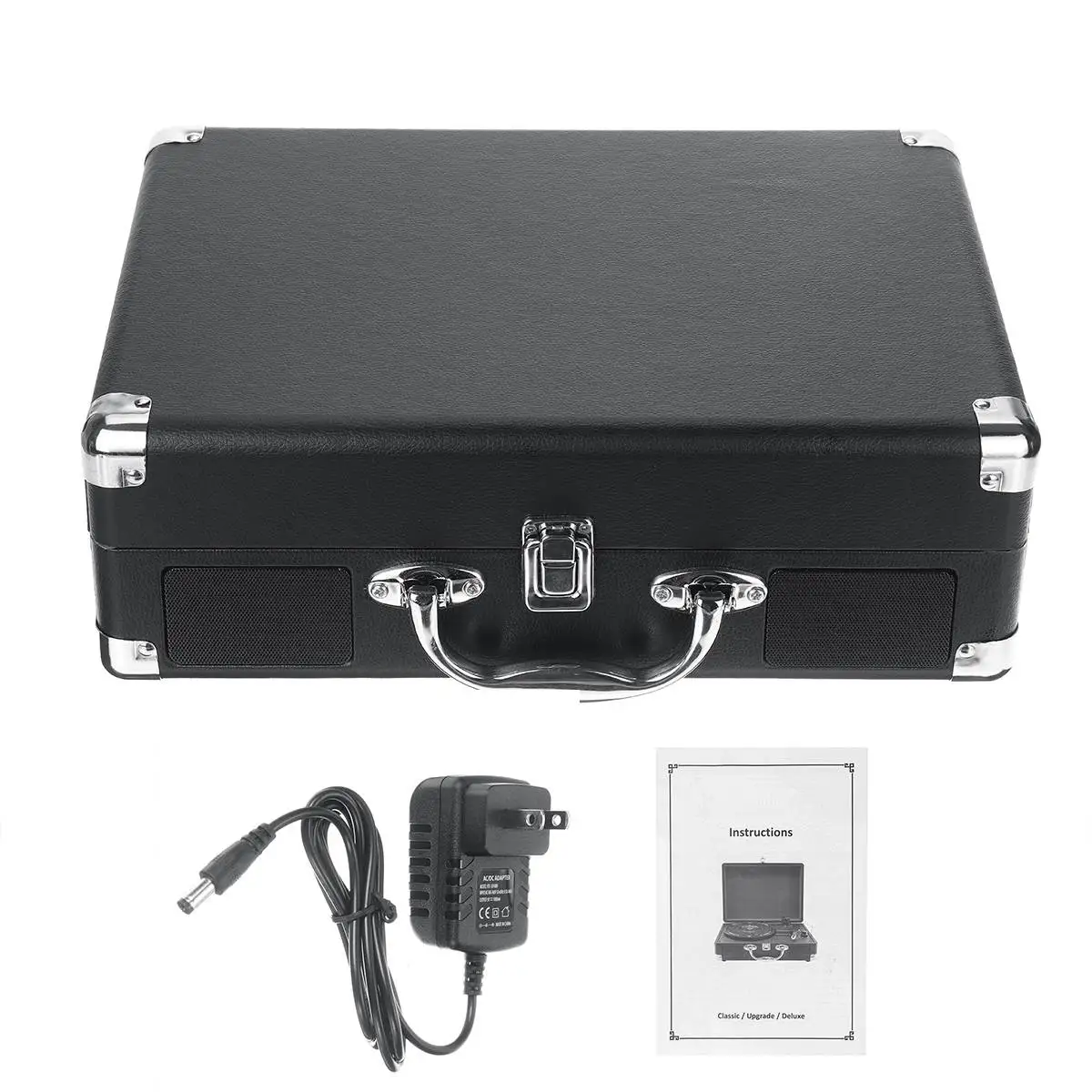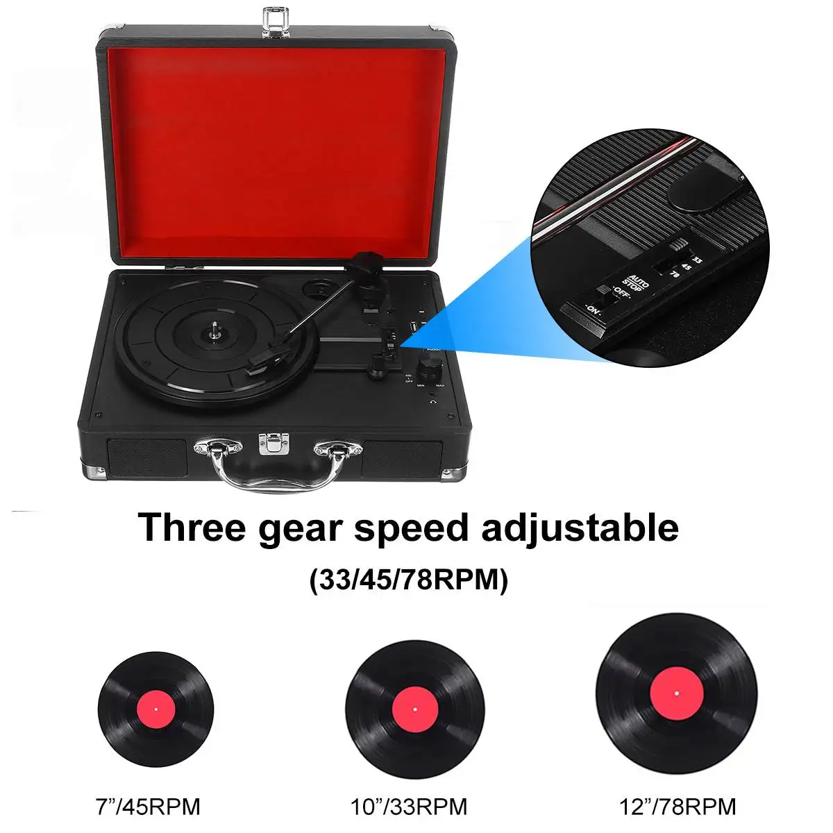 Особенности:【Поддержка беспроводного воспроизведения по bluetooth】【Три способа воспроизведения 】Виниловая запись (не входит в комплект) /USB/bluetooth【 Нескользящая подкладка для ног【Three скорость adjustable】 33/45/78 об/мин【Aux inГнезда для наушников】【Встроенный стерео колонки】【Из искусственной кожиЧемодан, легко переносить