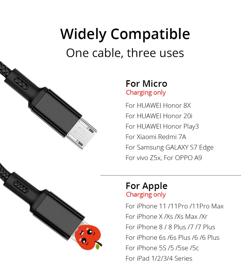 Кабель Micro USB 3 в 1 для iPhone 8, X, 7, 6, 6S Plus, iOS 10, 9, 8...