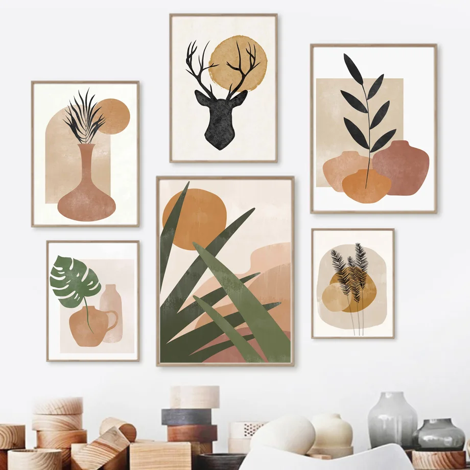 Богемная ваза монстера, тростник, олень, абстрактная настенная Картина на холсте, скандинавские постеры и принты, настенные картины для декора гостиной